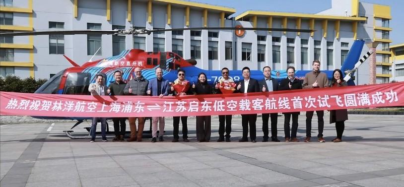 2月18日,一架满载乘客的BELL505直升机从上海浦东软件园起飞,跨越长江、崇明岛,平稳降落在位于启东市的林洋园区内,这条连接沪苏两地的低空载人飞行航线顺利完成试飞。