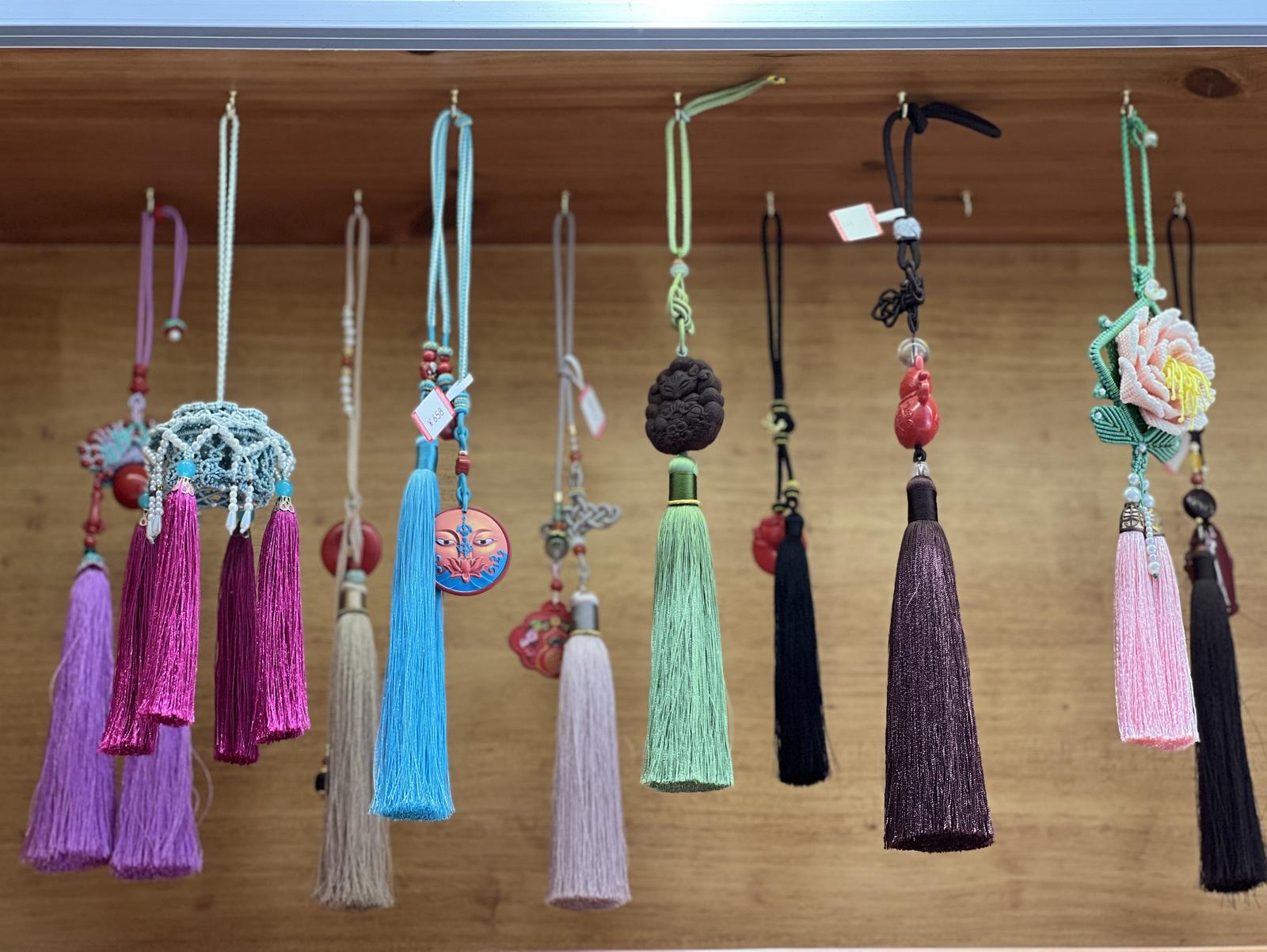 走进刘丽的工作室,仿佛踏入一座绳结的世界。丝线粗细不一,色泽各异,墙上悬挂着百余种结法图谱,案头陈列着造型各异的创意作品:端午主题绳结缀着迷你粽与艾草香囊,韩国韩服娃娃颈间系着改良版蝴蝶结,甚至还有为灵隐寺定制的禅意挂饰。