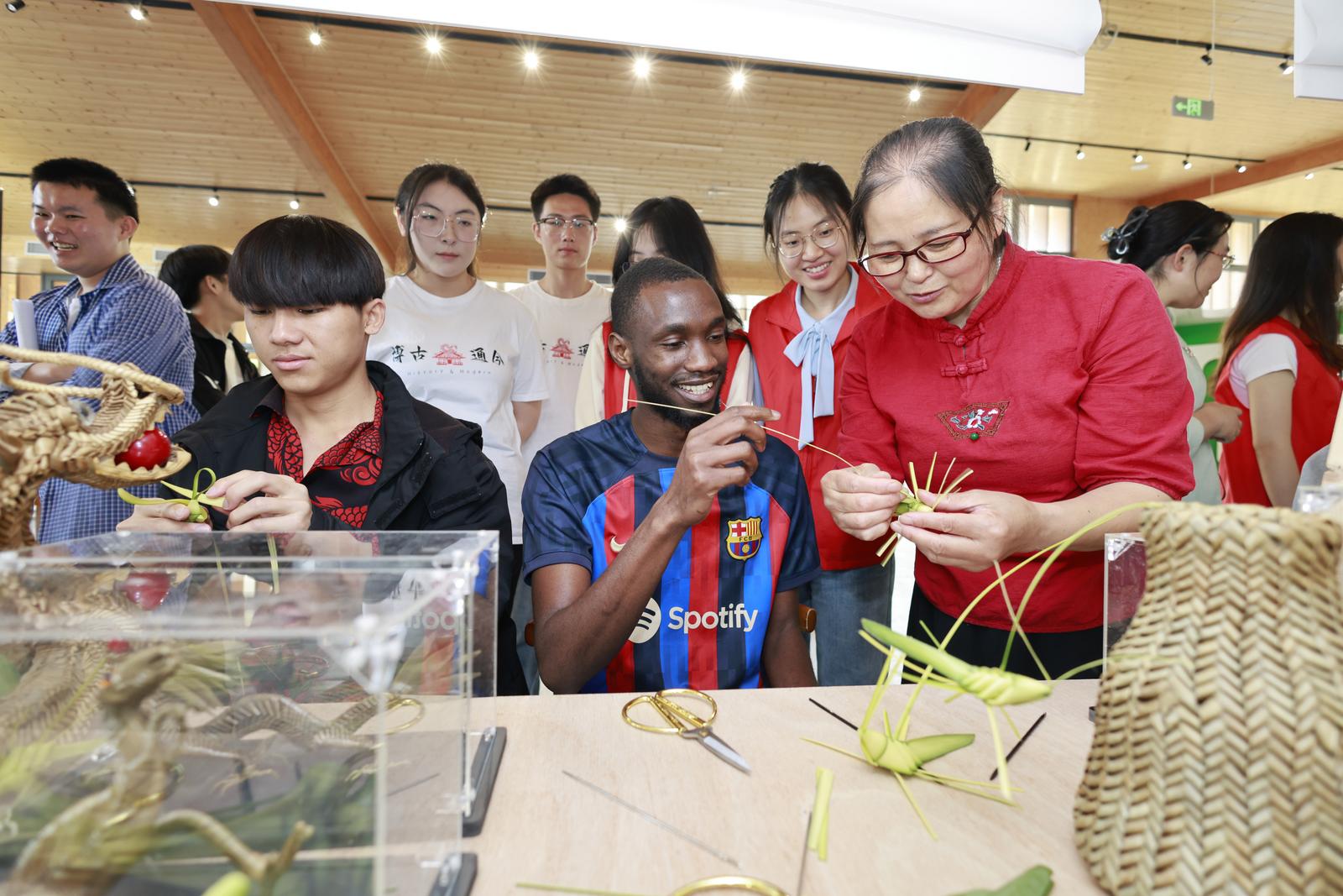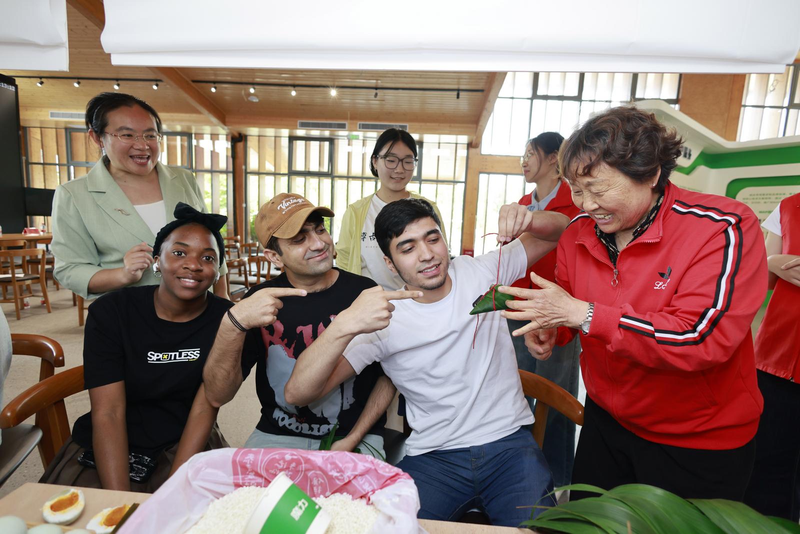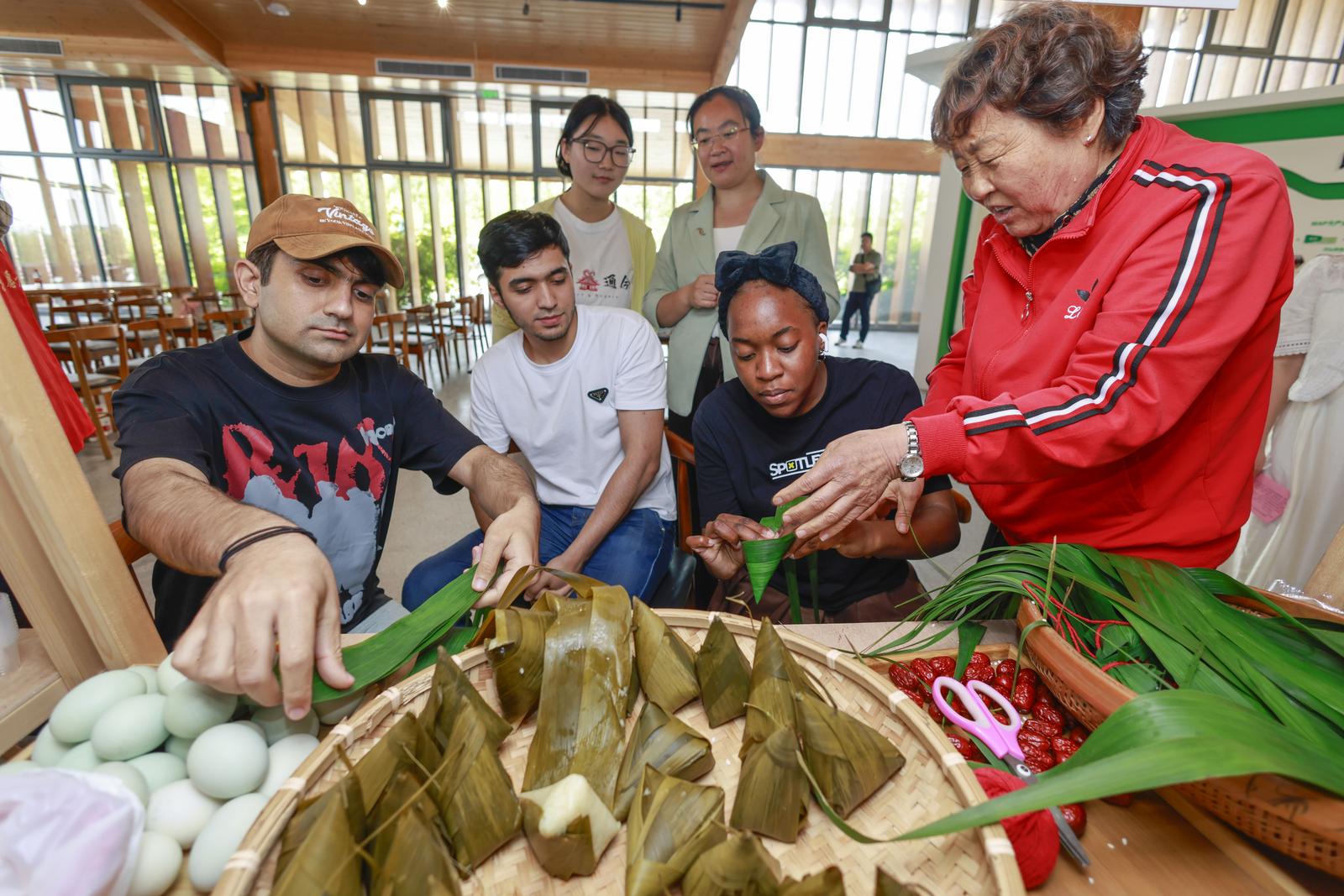 活动现场还精心设置了美食体验区域,志愿者教他们包粽子,学习棕编蚂蚱,田间割麦等,体验中国传统农耕文化。