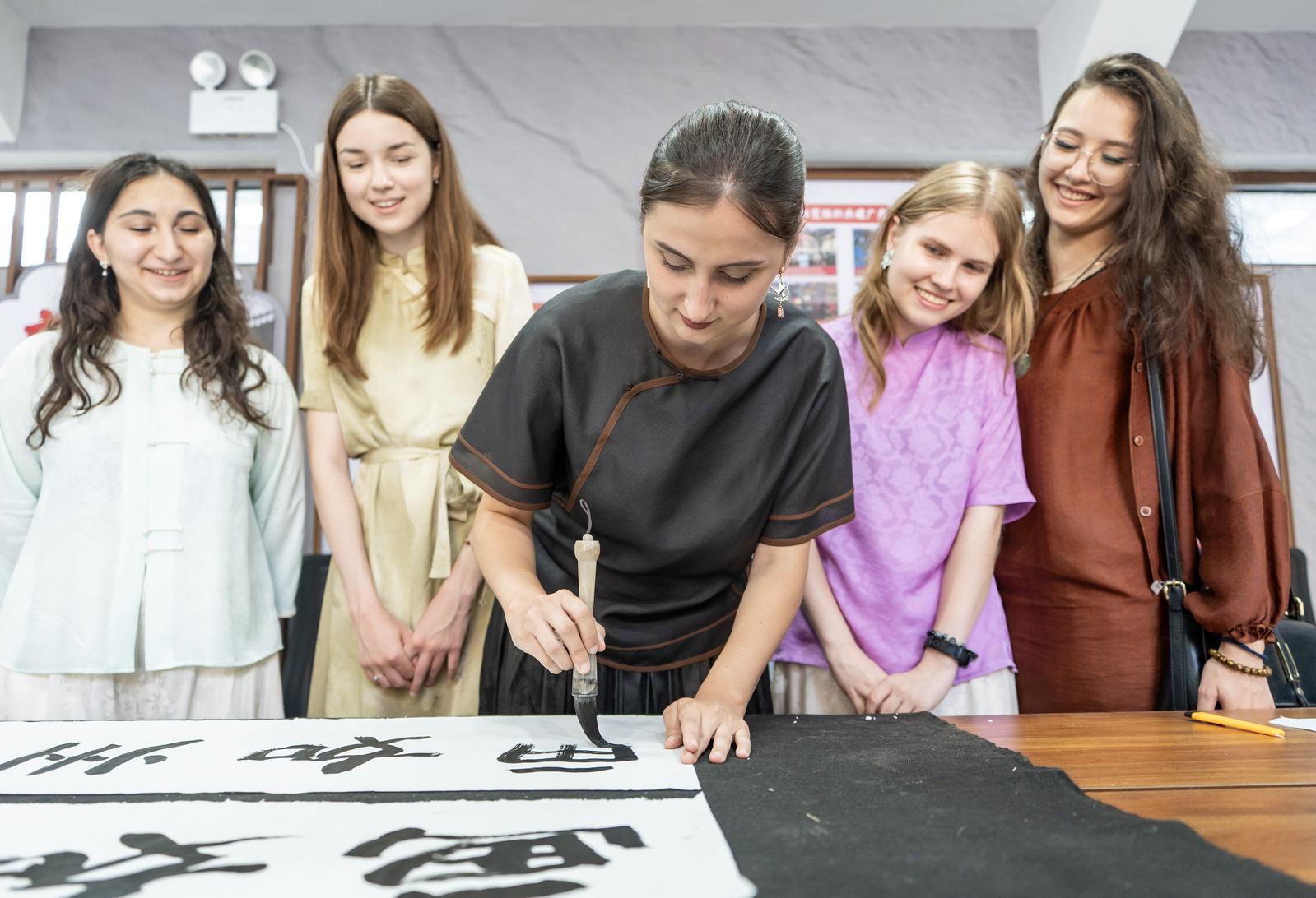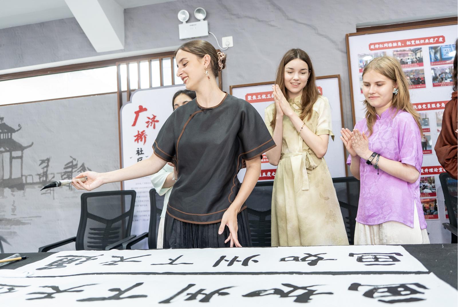 On 26th June, Nantong Tongzhou District held a Chinese and foreign cultural exchange activity. University students from Russia were experiencing writing Chinese characters with a brush in Shigang Town.