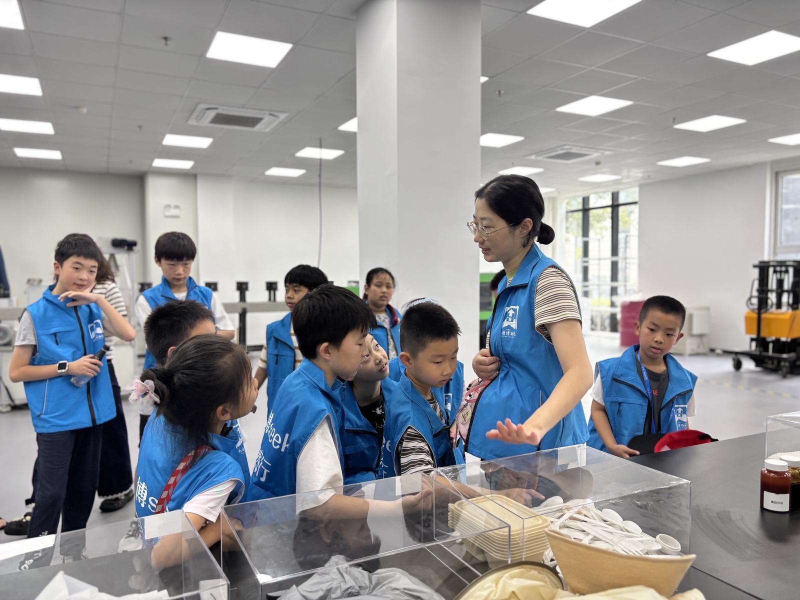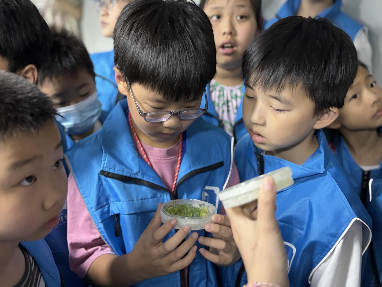 在专业人员的带领下,小记者们首先参观了公司的植物基淀粉环保材料研发实验室。透过观察窗,孩子们目睹到基因编辑的全流程:从构建载体、农杆菌侵染,到育种育苗、果实收获,再到淀粉提取和可降解产品制作。当看到实验室里的特种淀粉最终变成环保饭盒、垃圾袋等日常用品时,大家纷纷发出惊叹。“通过基因编辑技术,我们可以改变淀粉的保水性等特性,这样制作出的环保产品不仅实用,还能减少白色污染。”三黍生物公司遗传转化产品经理唐雨薇的讲解,让孩子们对科技赋能环保有了更深的理解。