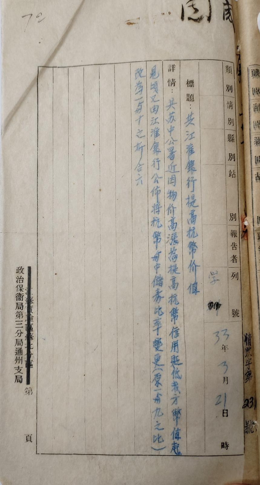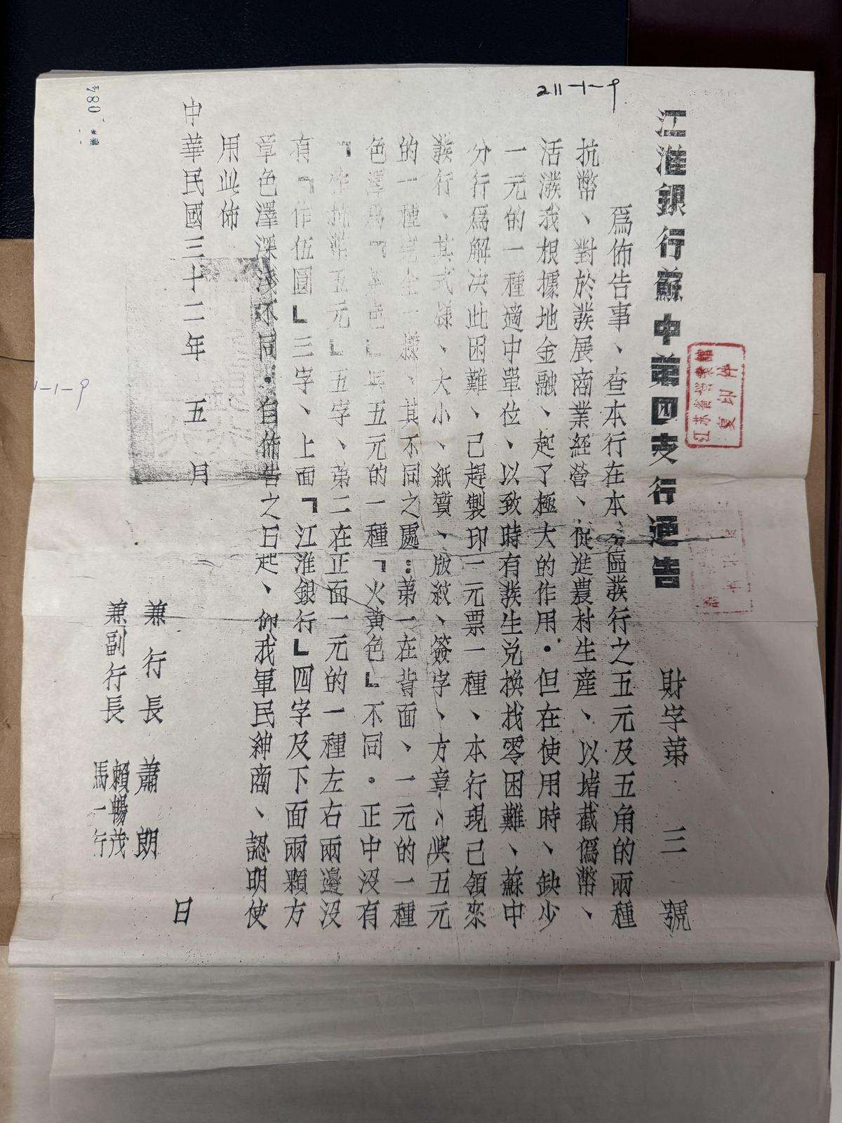 南通市档案馆存有一份民国三十三年(1944)3月21日,政治保卫局第三分局通州支局的记录《共江淮银行提高抗币价值》,通过降低抗币对中储券的兑换率,实质提高抗币价值(原9∶1现6∶1),鼓励民众拒收中储券。
