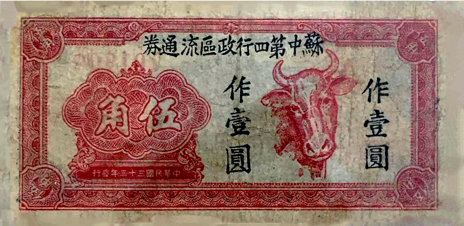 1944年下半年,江淮银行第四支行贸易课成立,隶属如东县财政局。民间交易找零不便,为解决辅币流通需要,课长丁恺联系韬奋印刷厂请求援手。韬奋印刷厂主要任务是印党报、图书和课本,从未印过钞票。他们同意拨两台机器,并派马骏、周鑫、张学奎等同志负责印刷。由杨斌联络,在上海制作7块印钞母版:正面1分、2分、3分、1角、2角、5角六种面值钞版;背面一块。年内,发行“苏中第四行政区流通券”,流通于东台、如皋、如东、海门、启东、南通等地。马塘临时流通券、皋东商店代价券、咸益公行流通券等七种版别,均用同一母版牛头主图。顾永祥说:“‘南通抗币’虽然流通期仅一年多,甚至几个月,但提高了人民群众对共产党和抗日民主根据地政府的信任度。”