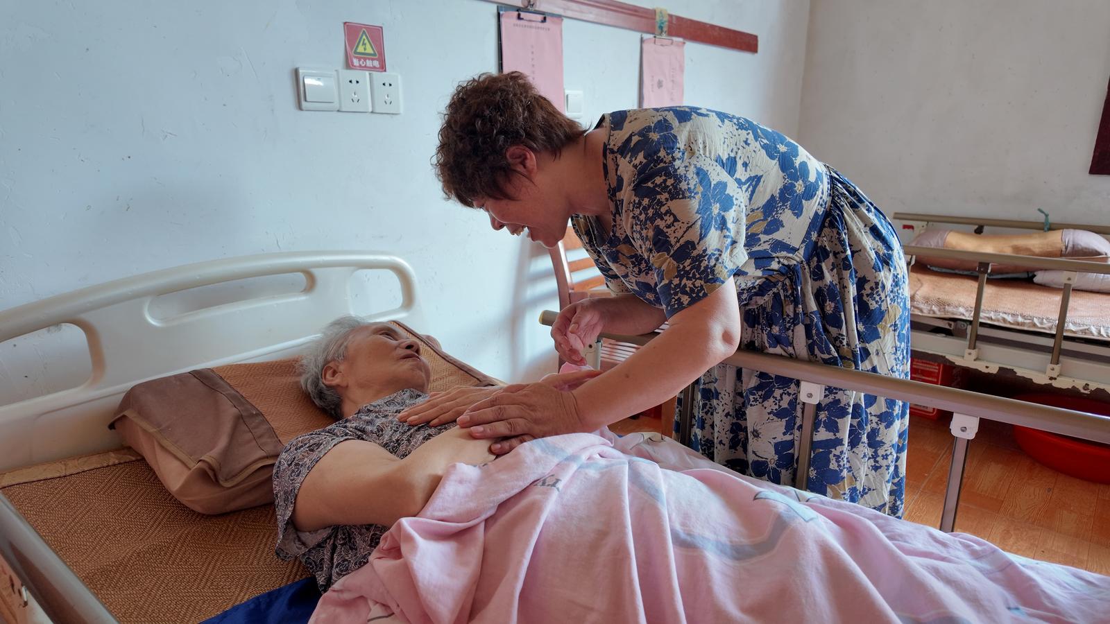 每天15分钟的按摩时间,是赵美兰最放松的时刻。陈美兰的手法不算专业,却足够认真,从膝盖到脚踝,每一寸肌肉都仔细揉捏。“她腿不能动,肌肉会萎缩,所以每天都要按摩。”陈美兰照顾的4位老人中,只有赵美兰能和她交流,更多时候,她是在对着神志不清的老人“自言自语”,但她从不觉得枯燥:“都是一个村的长辈,照顾他们就像照顾自家老人。”
