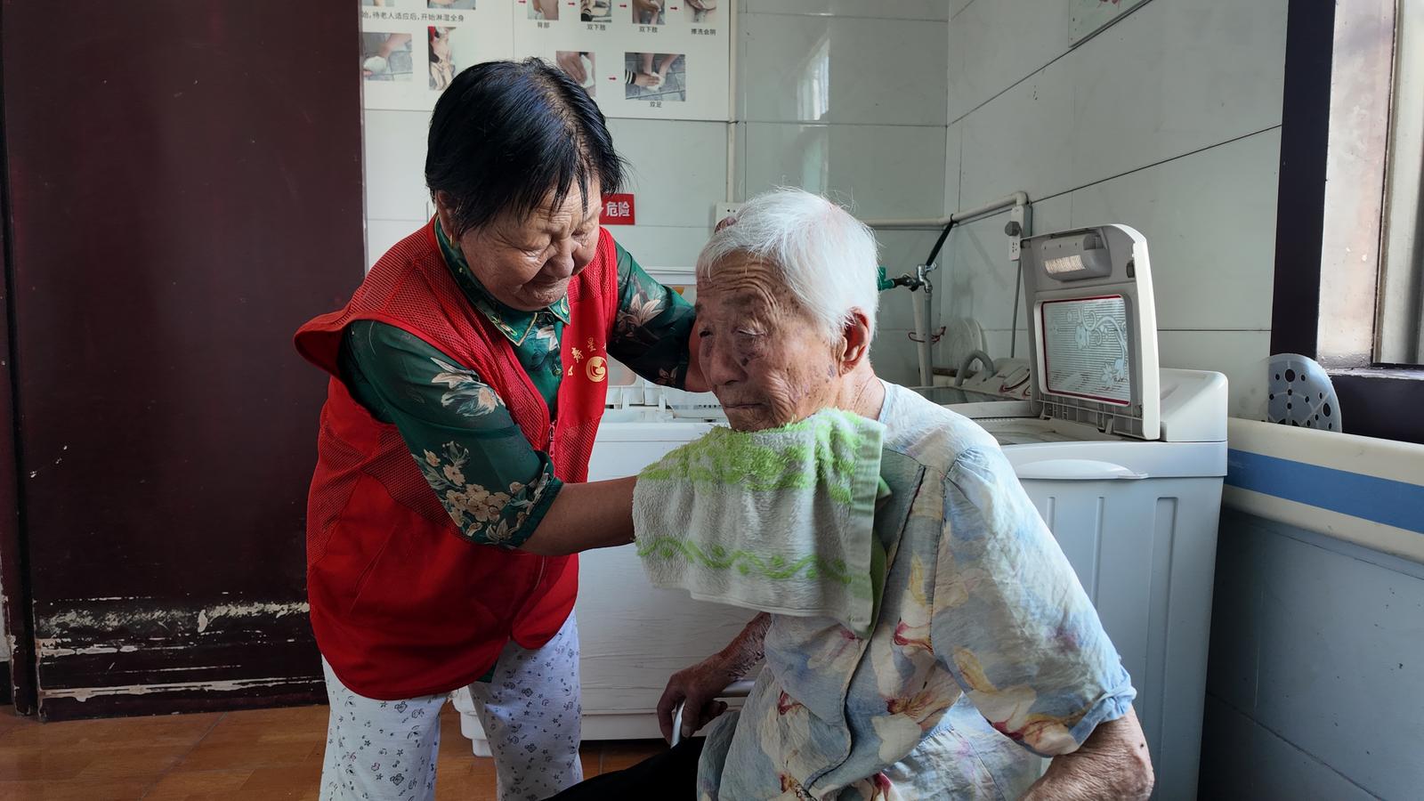 下午四点半,洗澡“大工程”准时开始。护理员们互相搭手,有的搀扶老人走进卫生间,有的推着轮椅将老人送进浴室。老人们坐在特制的防滑椅上,护理员手持莲蓬头,从头发到脚仔细冲洗。12位老人,一轮洗澡要花近三个小时,等最后一位老人收拾妥当,护理员们的衣服早已被汗水浸湿。