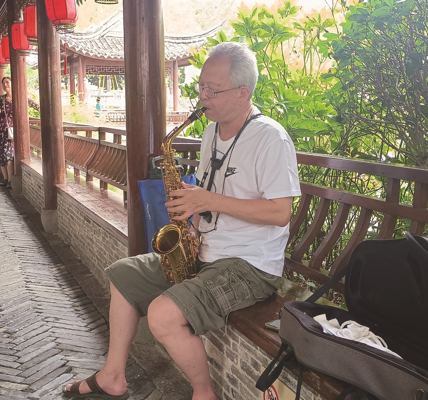 我不知曲子叫什么名字,只是感到旋律有些熟悉和亲切,如清泉般流淌的声音让我感到清凉和舒适。我驻足聆听并拿起手机想给这名吹萨克斯的老人拍一段视频。老人注意到了我,便停了下来,有些不好意思地对我说,他刚学习不久,吹得不好。他那泛着红光的脸庞上露出孩童般羞涩的笑容。我热情地鼓励老大爷说:“大爷,您吹得很好呀,我还从没感到萨克斯音乐这么好听呢!我想给您拍一段视频留个纪念!”听了我的表扬,老人脸上露出开心的笑容,又继续举起萨克斯,重新吹起刚刚的这支曲子。