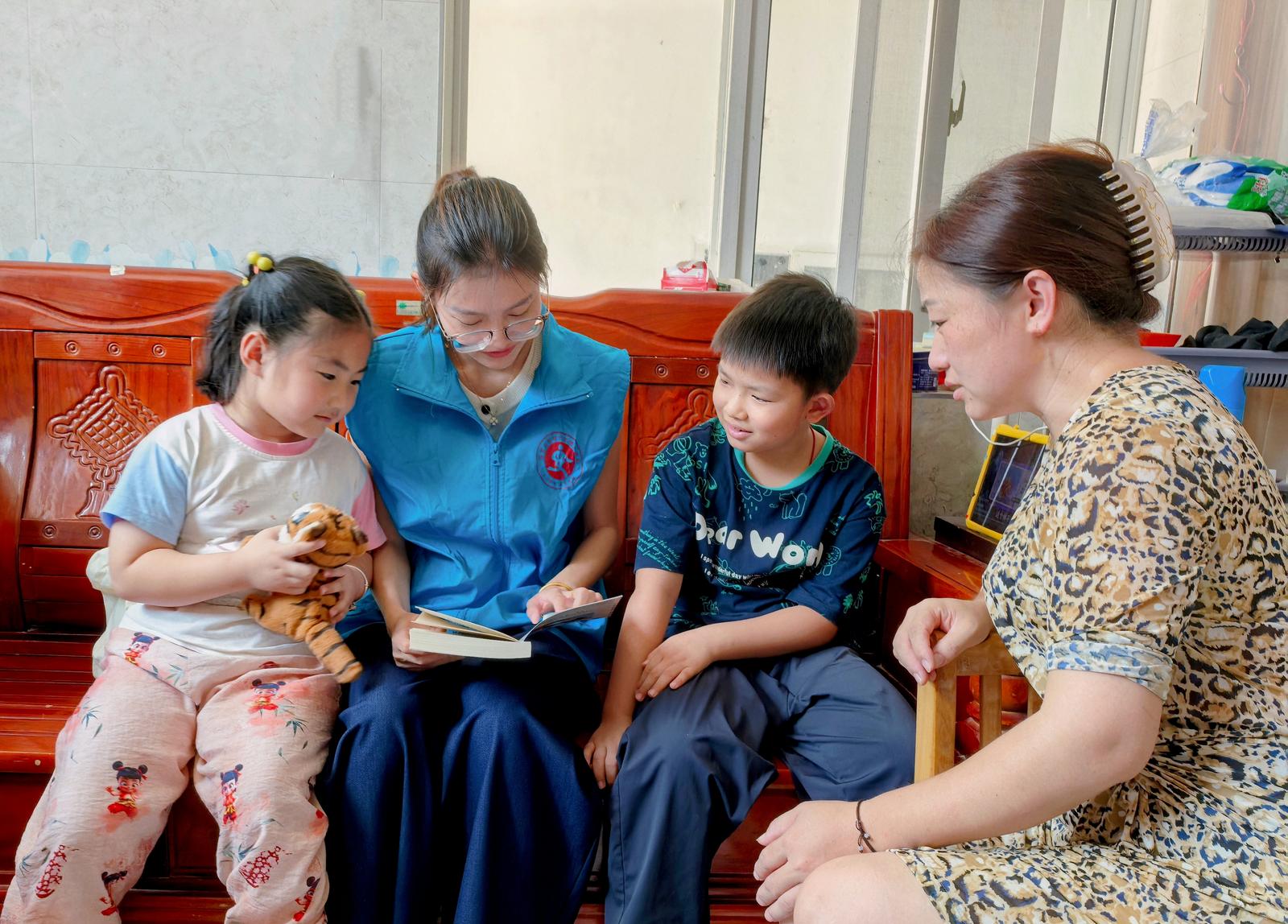 童声共读筑梦想:为儿童打开“精神天窗”。志愿者在农家书屋精心挑选了一批涵盖科普、文学、历史等多个领域的书籍,化身“阅读使者”走进儿童家中。详细了解孩子们的学习状态、心理状态以及家庭环境等情况,并为他们介绍书籍的内容与特色,鼓励他们多读书、读好书。孩子们依偎在志愿者身旁,一同朗读童话故事、探索恐龙奥秘,清脆的童声里,不仅传递着文字的温度,更满含对未知世界的好奇与向往。这场童声共读,为孩子们打开了“精神天窗”,让他们在图文世界中触摸山川湖海、搭建梦想阶梯。