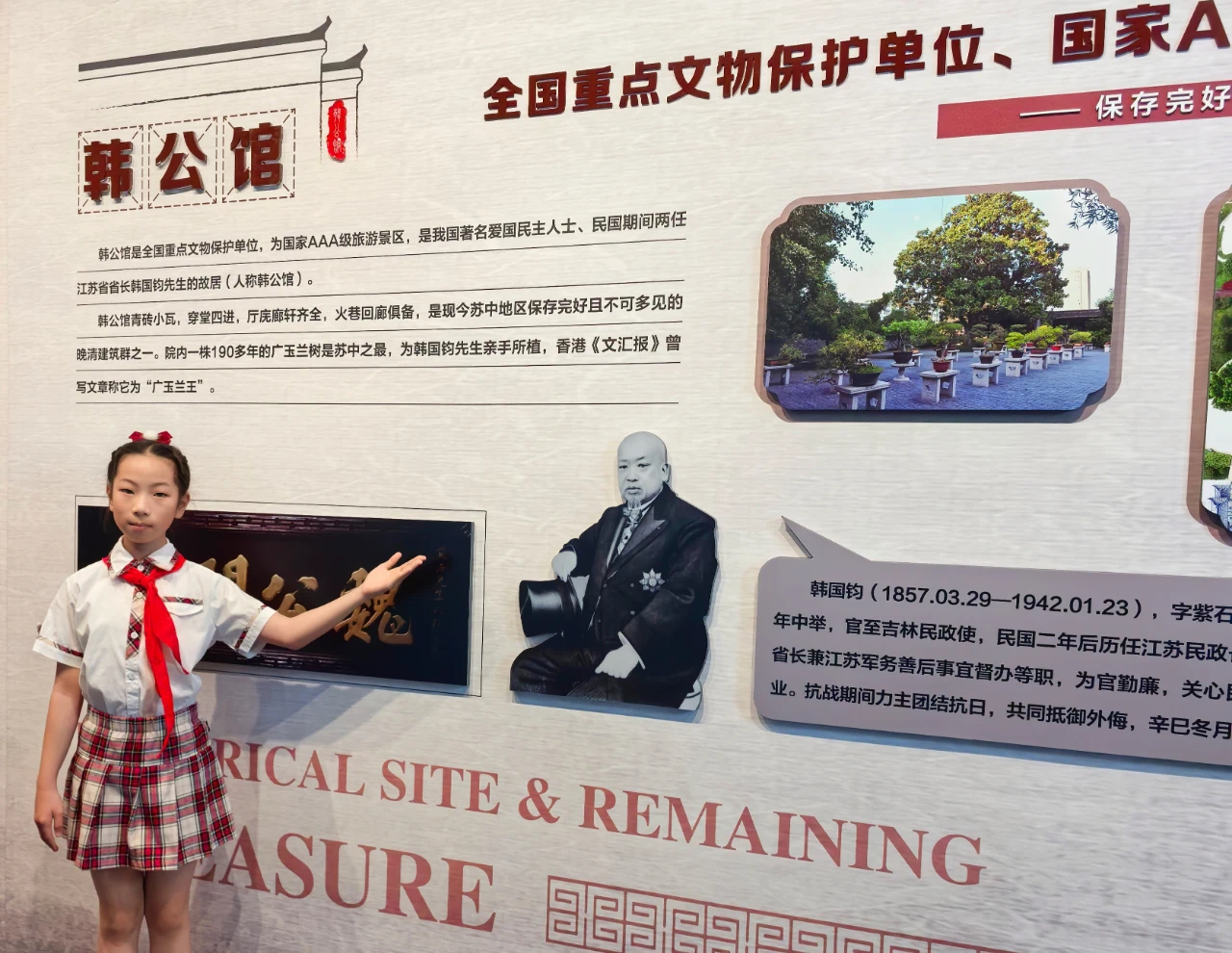 “各位观众请看,这两处藏在街巷里的院落,分别是苏北第一届参政会会址和韩国钧故居。虽不起眼,却记载着一段沉甸甸的往事……”来自海安市城南实验小学的四年级学生张诗涵指着展馆墙上的地图,流畅而饱含深情的讲解让人难以相信她只有11岁。作为学校“幸福娃”红领巾讲解员社团的一员,她整个暑假已经接待了多个参观团。