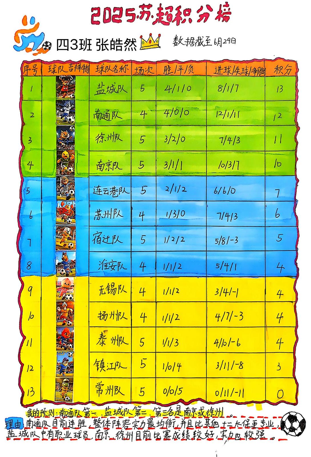 “苏超”的热浪,更从观众席涌入了孩子们五彩缤纷的暑期作业。通州区实验小学巧妙地将足球文化融入跨学科探索,让学习变得“足”够有趣——“小记者”们用一句话浓缩精彩;小球迷们用条形图分析进球数据;高年级还设计助威标语、绘制主题海报,甚至定制了融合景点、美食的足球文旅路线。