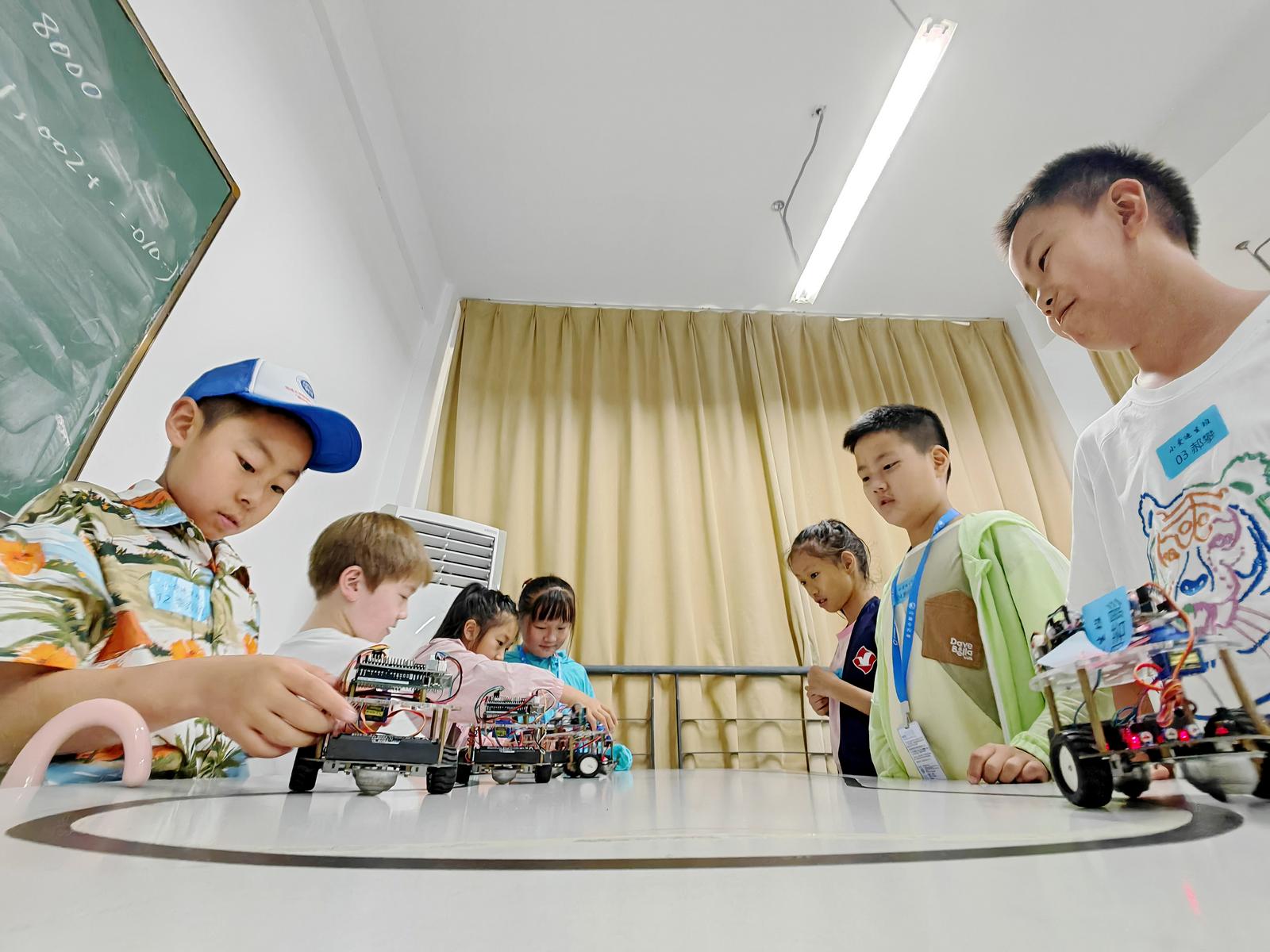 活动中,学员们在实际操作中感受光学的魅力。在老师的指导下,他们利用日常物品完成光学实验。当清水借助瓶身曲面将文字清晰投射到墙面时,孩子们自发围成一团,专注观察这一奇妙现象;老师适时引入凸透镜折射原理,深入浅出地予以讲解。在双面镜成像实验中,大家手持镜片调整角度,目睹镜像在镜面间无限延伸,在亲手操作中理解平面镜反射规律。借此机会,学员们还走进机器人编程教室,通过编程软件指挥机器人完成行进、绕圈等动作;当自己编写的代码成功转化为机器人流畅的动作时,教室内响起阵阵欢呼。