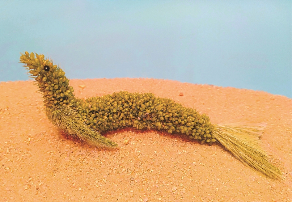 这外形独特且十分少见的草穗让我眼前一亮,脑海里立马浮现出一个动物形象,便将这根草穗拔掉,又拔了两根小一点的狗尾巴草穗和两根虎尾草穗带回家,将弯曲的狗尾巴草穗一头点缀上眼睛,再粘上狗尾巴草穗和虎尾草穗做的腹鳍和尾鳍,一只可爱的创意草穗海狮新鲜出炉。