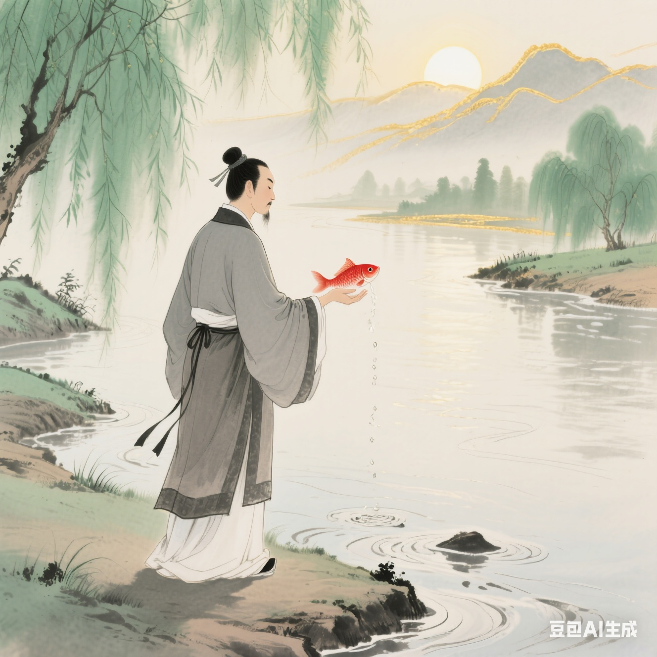 新修的栈桥在暮色里伸展,善男信女们立于其上。面包屑如雪纷坠水面,竟成粒粒浮沉的往生咒。此情此景,令江水蓦然显得轻俏温柔,驮得起满山青黛的倒影。山色如绿绸铺展于水面,随波轻曳。