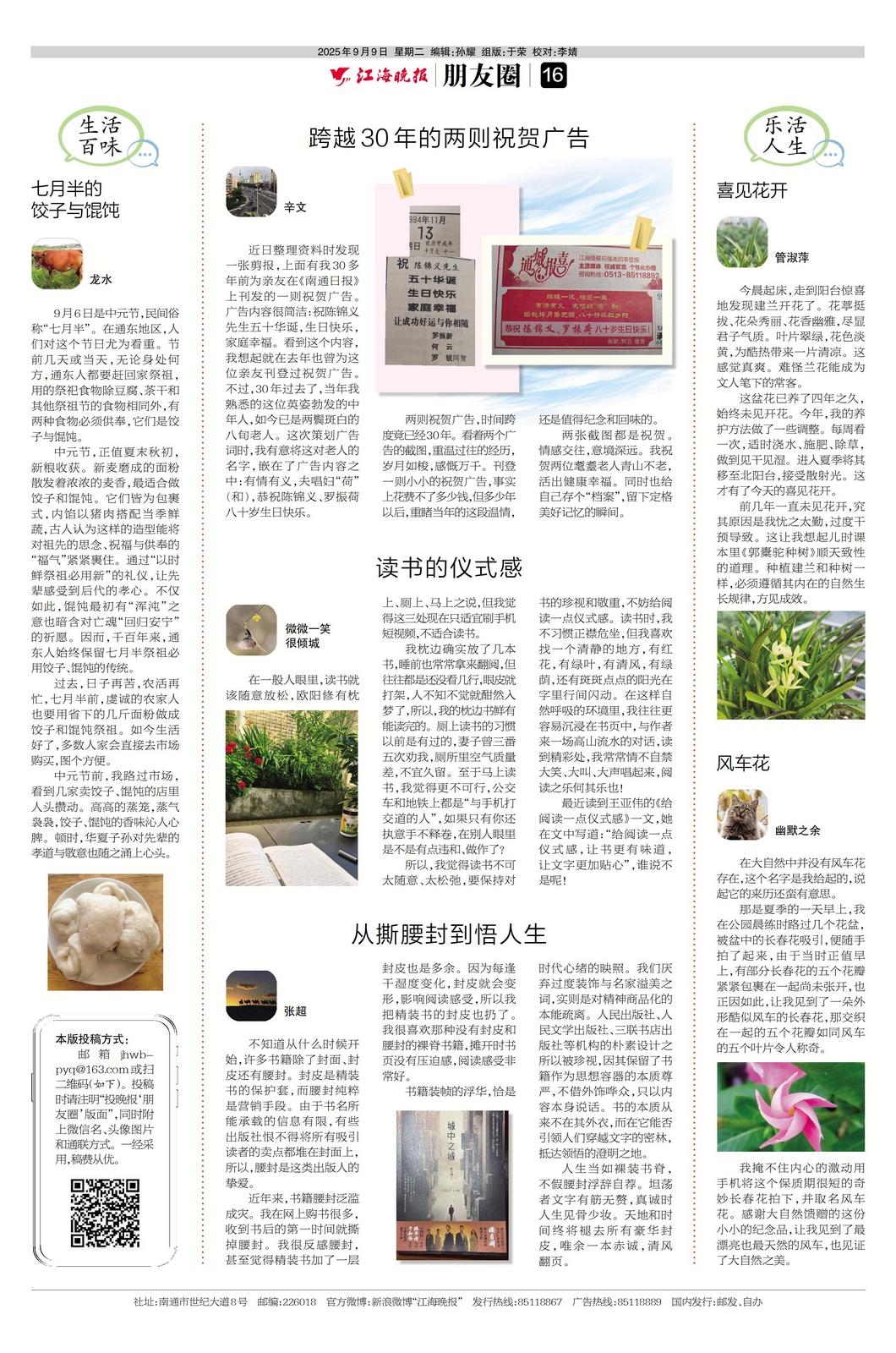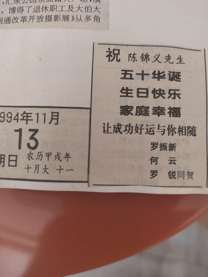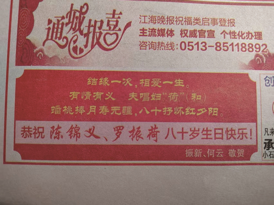 近日整理资料时发现一张剪报,上面有我30多年前为亲友在《南通日报》上刊发的一则祝贺广告。广告内容很简洁:祝陈锦义先生五十华诞,生日快乐,家庭幸福。看到这个内容,我想起就在去年也曾为这位亲友刊登过祝贺广告。不过,30年过去了,当年我熟悉的这位英姿勃发的中年人,如今已是两鬓斑白的八旬老人。这次策划广告词时,我有意将这对老人的名字,嵌在了广告内容之中:有情有义,夫唱妇“荷”(和),恭祝陈锦义、罗振荷八十岁生日快乐。