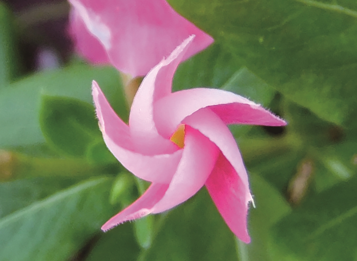 那是夏季的一天早上,我在公园晨练时路过几个花盆,被盆中的长春花吸引,便随手拍了起来,由于当时正值早上,有部分长春花的五个花瓣紧紧包裹在一起尚未张开,也正因如此,让我见到了一朵外形酷似风车的长春花,那交织在一起的五个花瓣如同风车的五个叶片令人称奇。