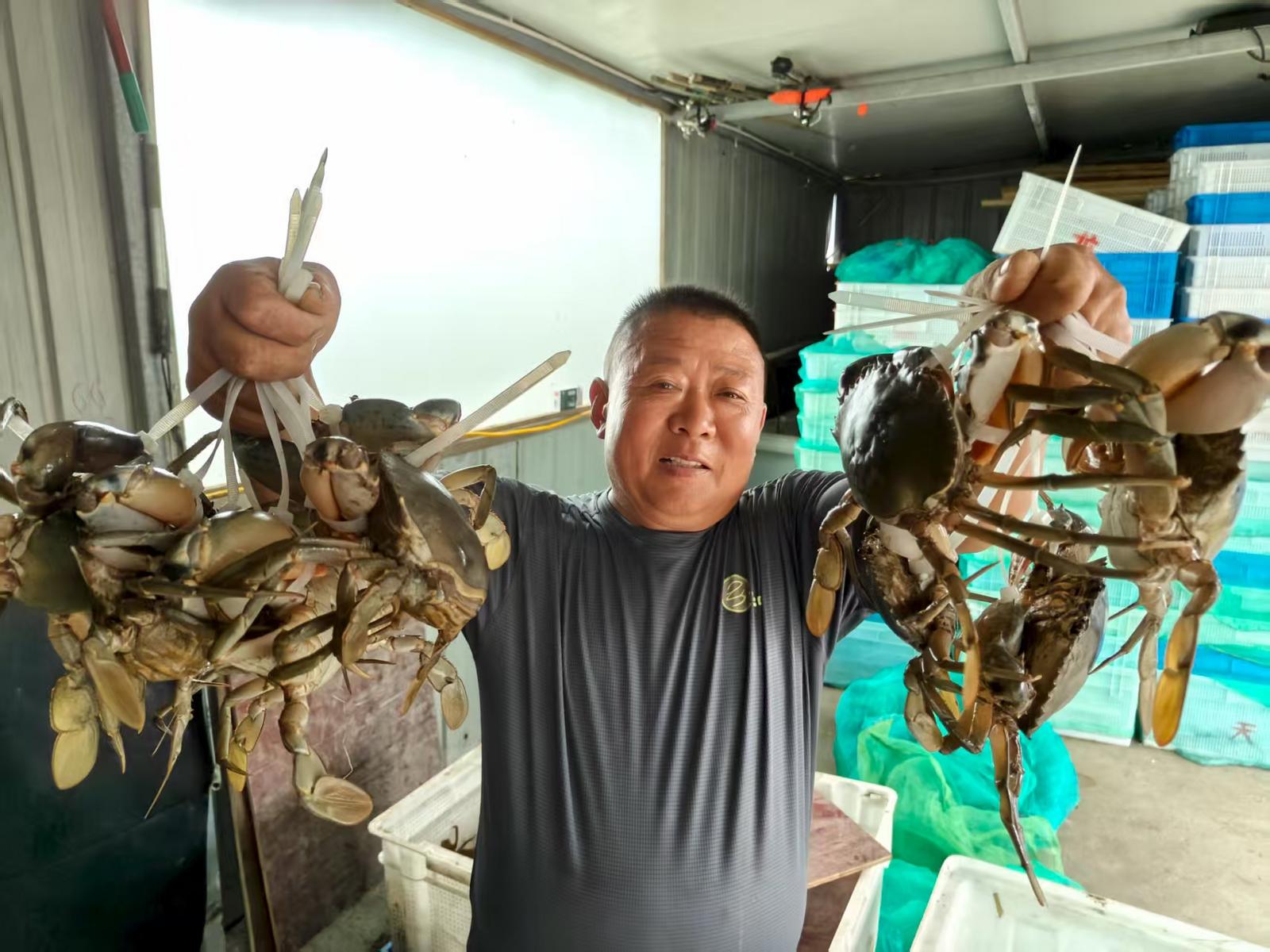 没有梭子蟹“横行霸道”,海水池塘降了水质、少了活力、减了效益。2016年起,张义春通过浙江客户,致力于寻求新的能与白虾相融共生的替代品种。在历经鱼、贝、蛤、蟹等多个品种引进试验后,2020年,他终于成功找到突破口:“池塘‘阴阳水’,能促成锯齿青蟹长成更大个体、更肥肉质、更鲜味道,品质产量居然比原产地还高出一筹。”他介绍,相较于梭子蟹,青蟹在塘内生长时间缩短一个半月,个体大了将近1倍,产量增幅约50%,效益提升三成以上。