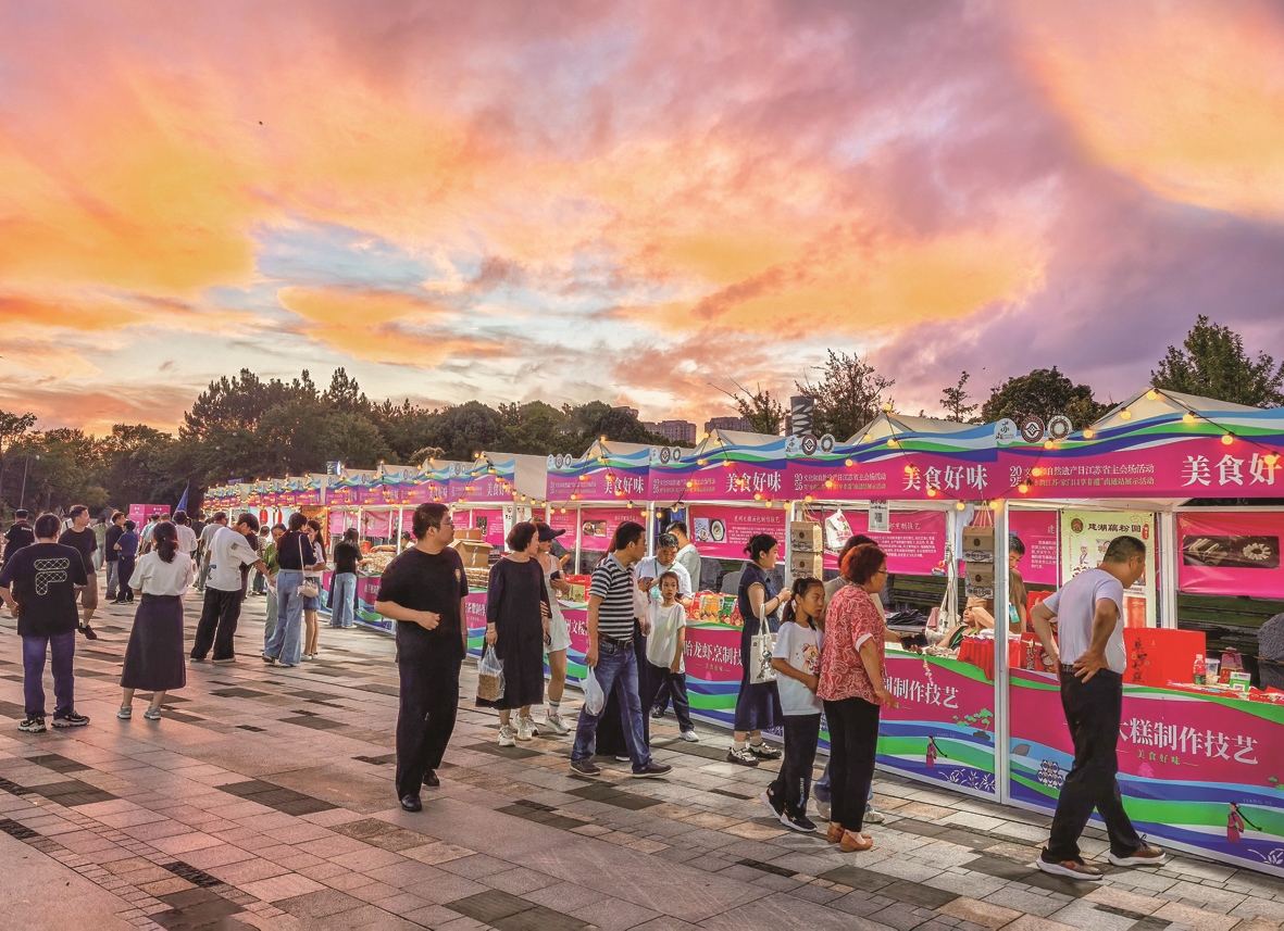 6月15日,海门区江海公园,“文化和自然遗产日”江苏主会场活动现场,晚霞彩云装点着市集。 褚晓萍