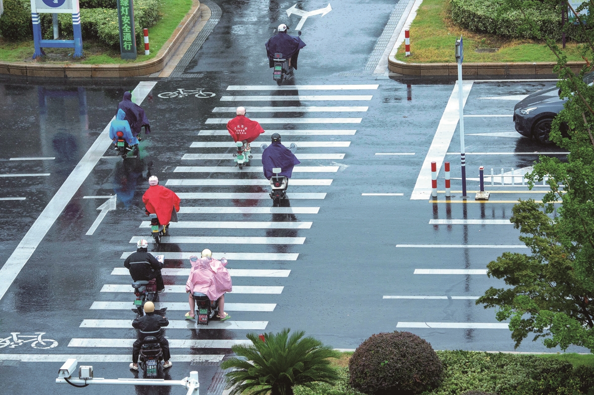 7月30日,海安市街头,人们行进在风雨中。当日,受今年第8号台风“竹节草”影响,南通迎来较强风雨。 徐劲柏
