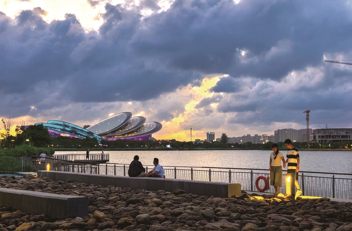 7月21日,启东市蝶湖公园,人们在湖边散步。 黄是春