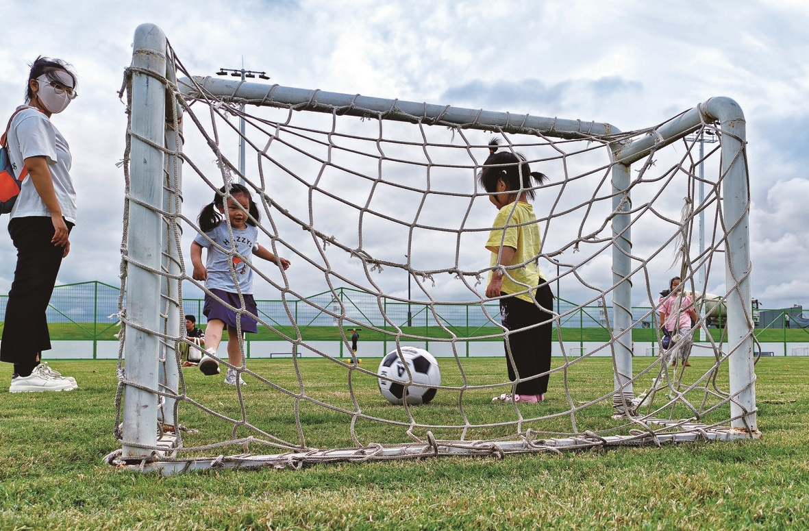 9月9日下午,南通长江体育公园,娃娃们在家长的看护下,玩起了足球。瞧,她们踢得还有模有样。 李斌