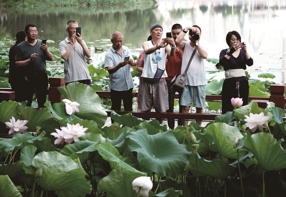 7月12日,濠河风景区启秀荷塘,不少摄影爱好者来拍摄荷塘美景。 宋诚林