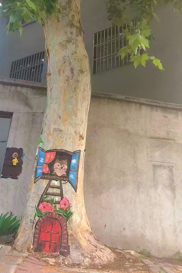 我是在一个小巷深处发现这些细节的。这是一幢二十世纪八九十年代的工厂宿舍楼,环绕楼房的斑驳围墙,那些裂开的缝隙、掉落的沙灰诉说着岁月的沧桑。围墙旁立着一棵梧桐树,它没有如云的树冠,也没有遒劲的枝条,反而在向上的生长过程中有些歪斜。但这并不妨碍浪漫的都市人,把它变成一件令人惊艳的艺术品。有人在树干底部绘出一扇拱形小门,门上架着小小的木梯,连接至一扇敞开的窗,粉色的窗帘飘起,一只可爱的小松鼠探出身子,一双圆溜溜的眼睛眺望远方,窗玻璃上还倒映着蓝天白云。再望向灰白的旧墙,墙上有一只憨态可掬的小棕熊,正在津津有味地舔冰激淋,贪吃的模样让人忍俊不禁。墙根处,还绘有一丛碧绿的兰草,炎炎夏日,这抹绿色似带来丝丝凉意。