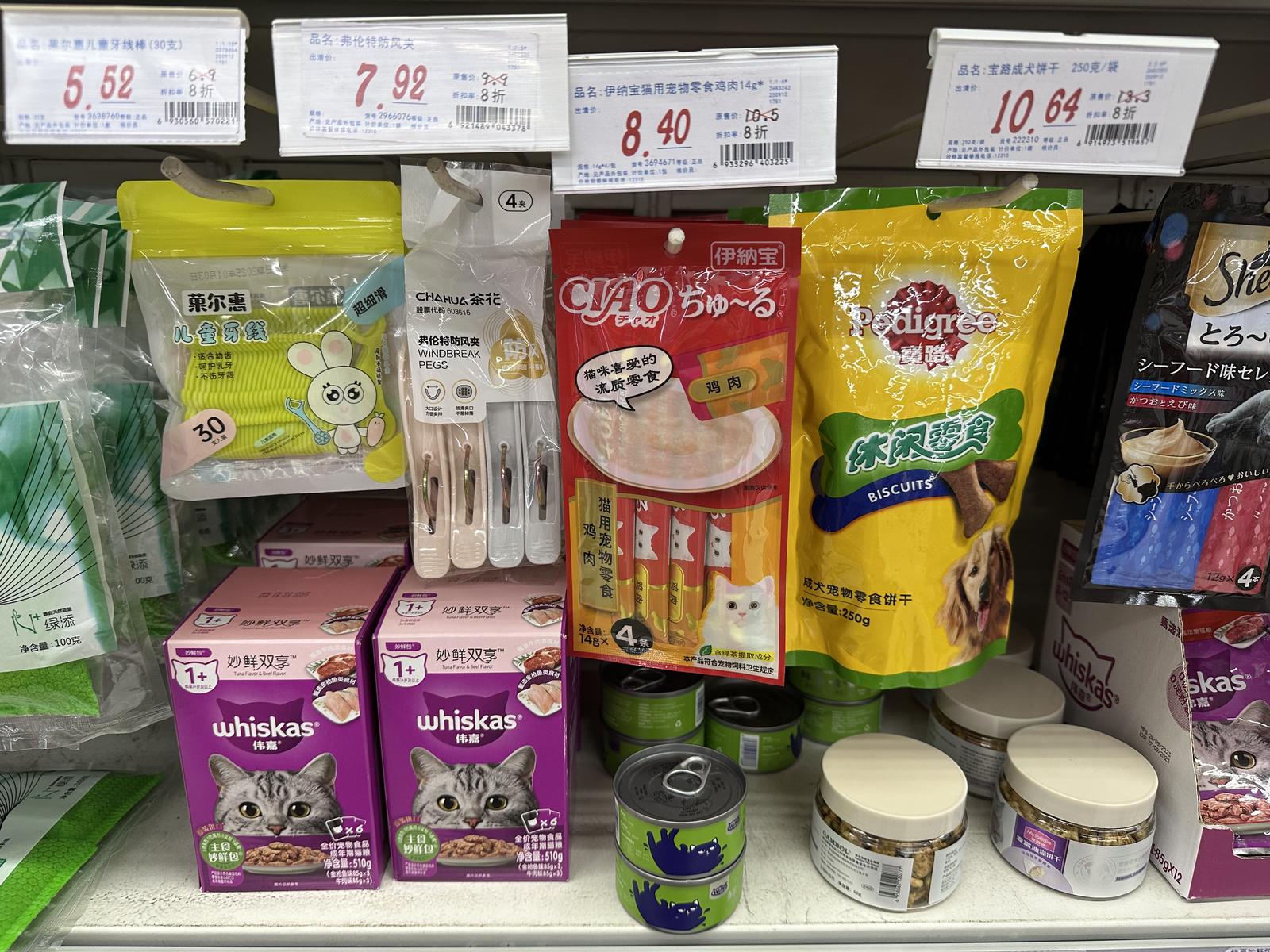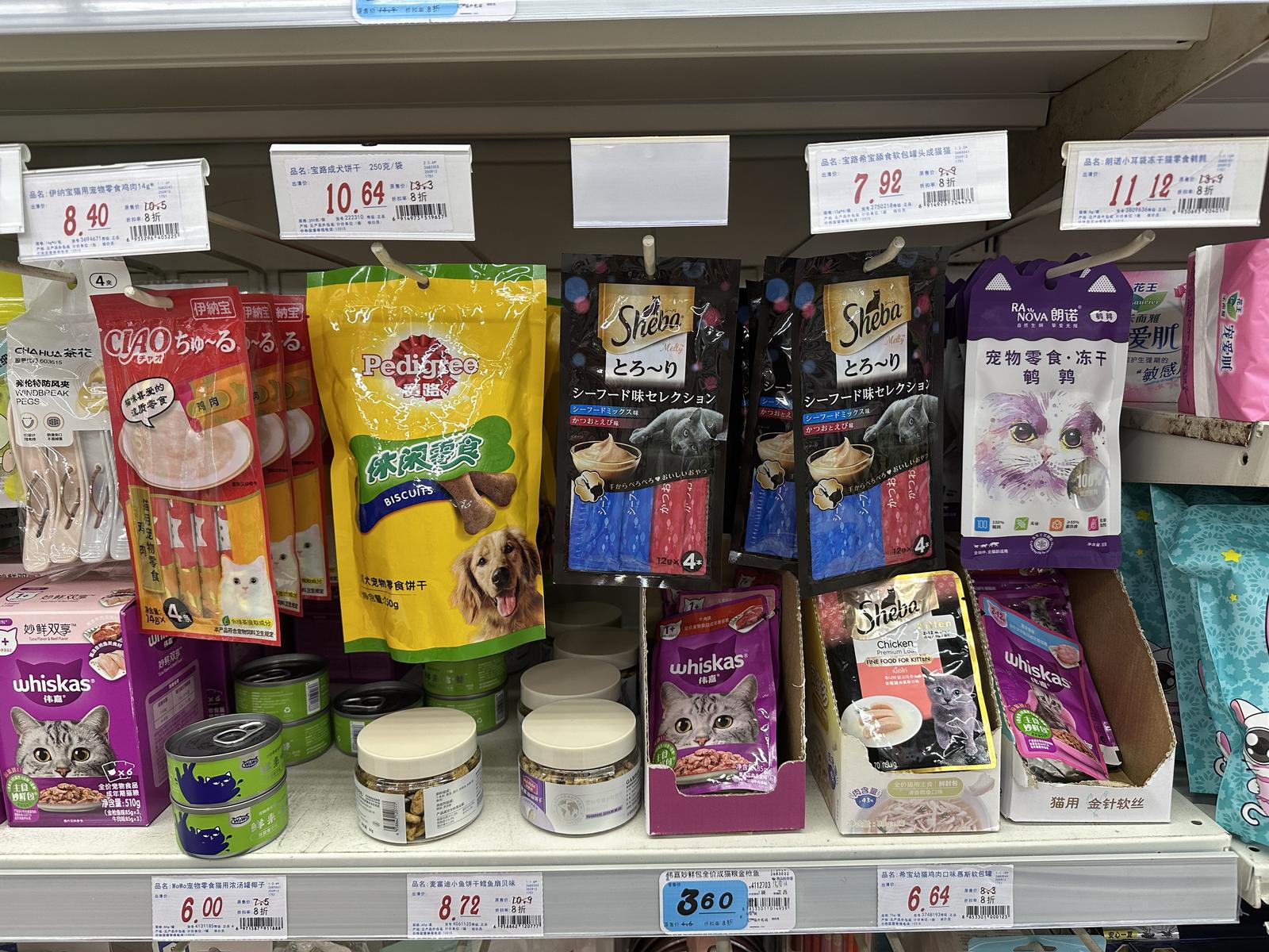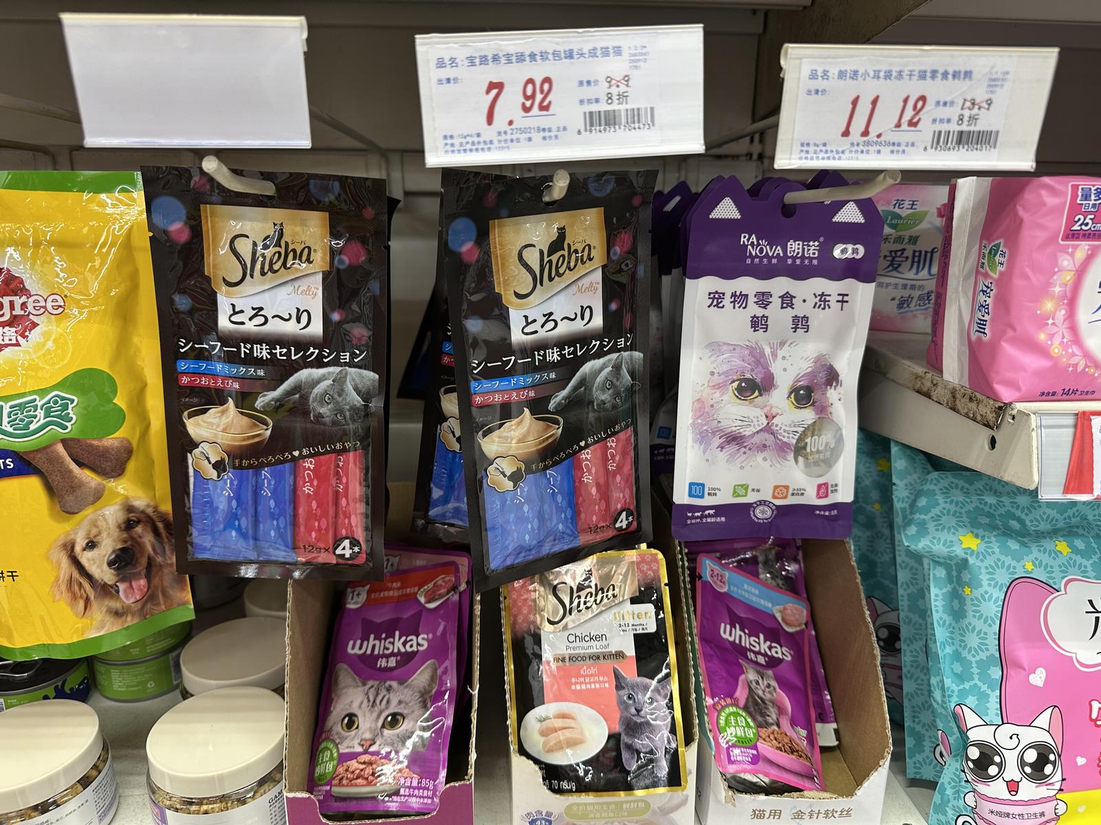 罐头、猫条、冻干……记者现场看到,除了常规的临保期食品之外,不少宠物食品也加入临期促销商品的行列,享受不同力度的折扣。