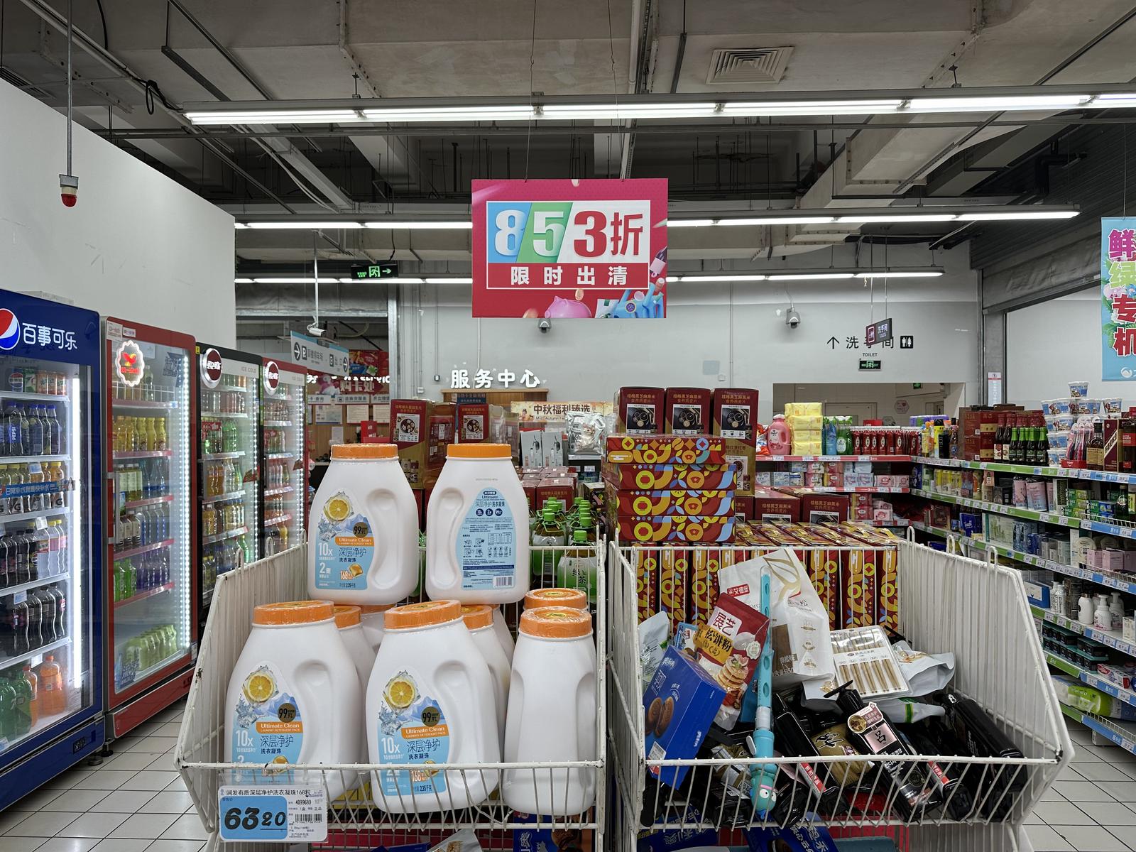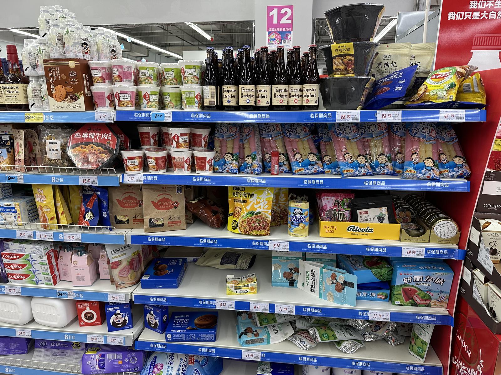 低糖花生酥、麻酱牛肉拌面、手帕纸、卫生巾、品牌牙膏、洗洁精……在位于崇川区深南路的大润发内,离收银台不远的货架上集中摆放着多款临期商品。上方悬挂着醒目标识,标明以8折、5折、3折的优惠力度限时出清。