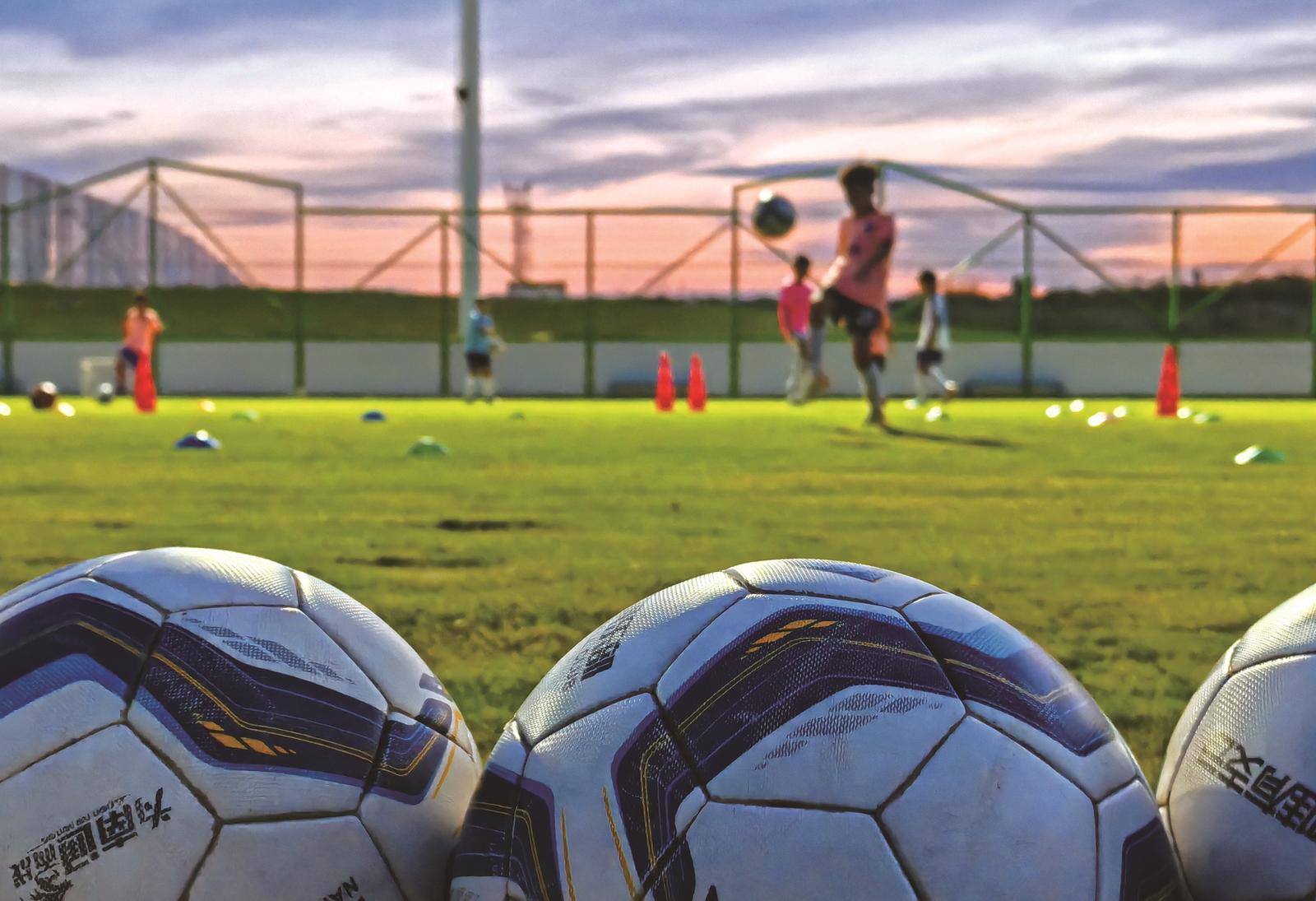 9月11日傍晚,南通长江体育公园少儿足球片区,晚霞映红江畔球场,4家少儿足球培训班的60多名孩子在接受培训。 李斌