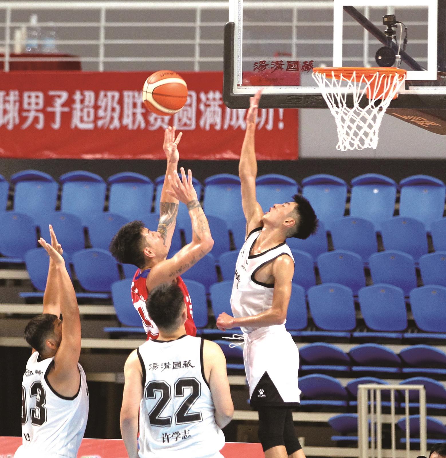 9月17日,2025年江苏省城市篮球男子超级联赛进入第二比赛日,4支南通球队悉数亮相。图为南通耀东电竞队(白色球衣)在小组赛中奋力防守。 李小波
