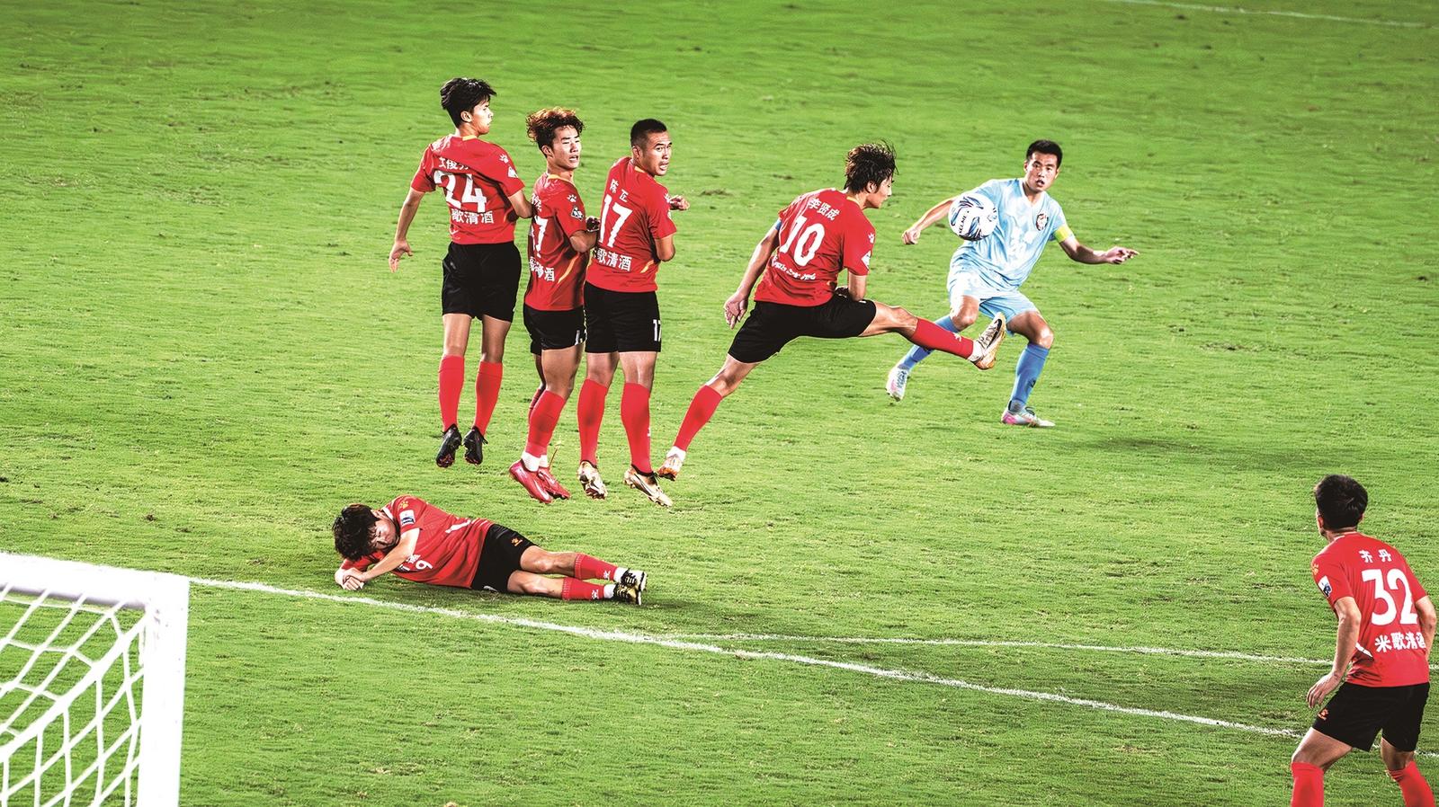 7月19日晚,南通队主场迎战盐城队。经过90分钟大战,南通队以2∶1战胜对手。图为南通队全力防守对方任意球攻门。 赵海涛