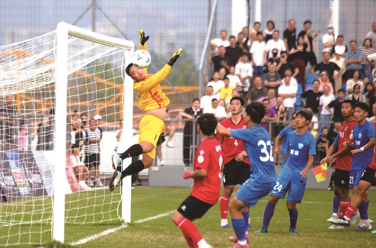 9月7日,南通长江体育公园绿茵场上,南通市秋季业余足球联赛再燃战火,如皋队与如东队捉对厮杀。图为门将飞身扑救,眼看足球擦过指尖。 倪健