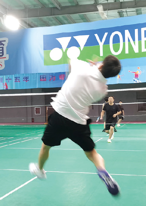 昨晚,南通经济技术开发区星辉体育羽毛球馆,市民积极参加运动健身。图为一人跃起大力扣杀。 张大春