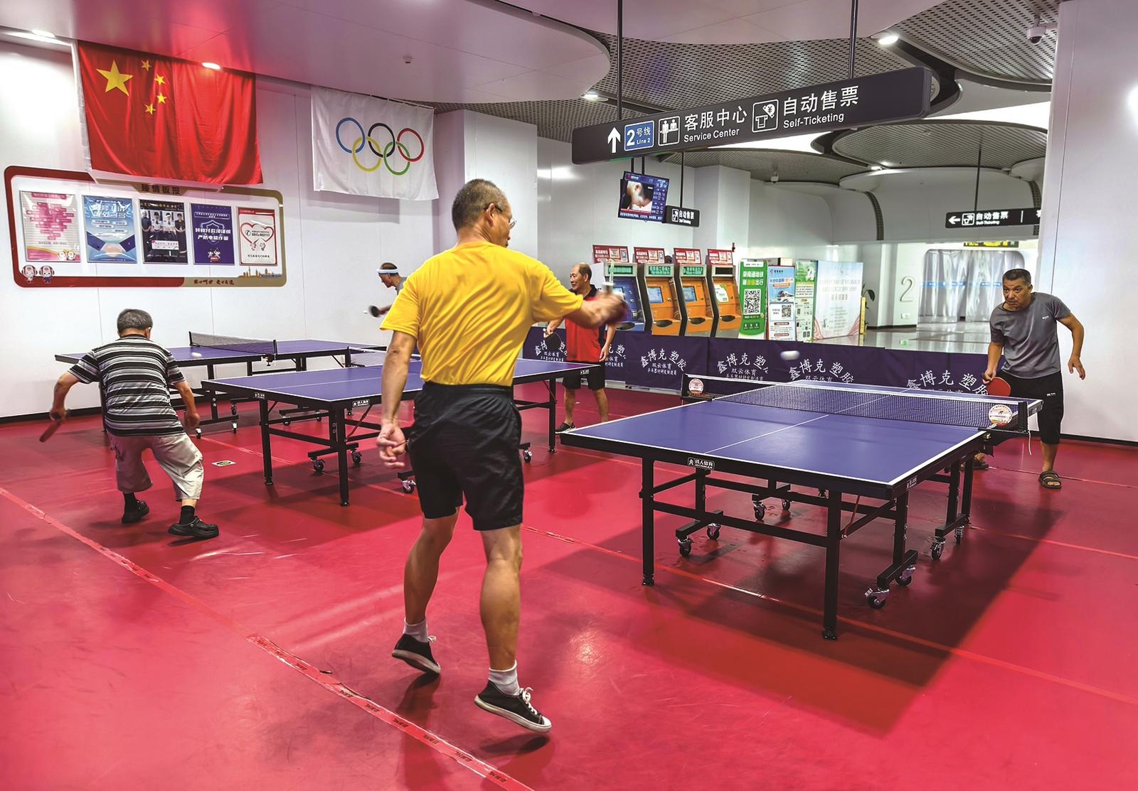 8月1日,南通轨道交通集团有限公司在地铁2号线体育公园站内设置了4张乒乓球台,供乒乓球爱好者切磋球技。地铁站内充足的空调冷气给打球的市民提供了舒适的环境。 袁德君