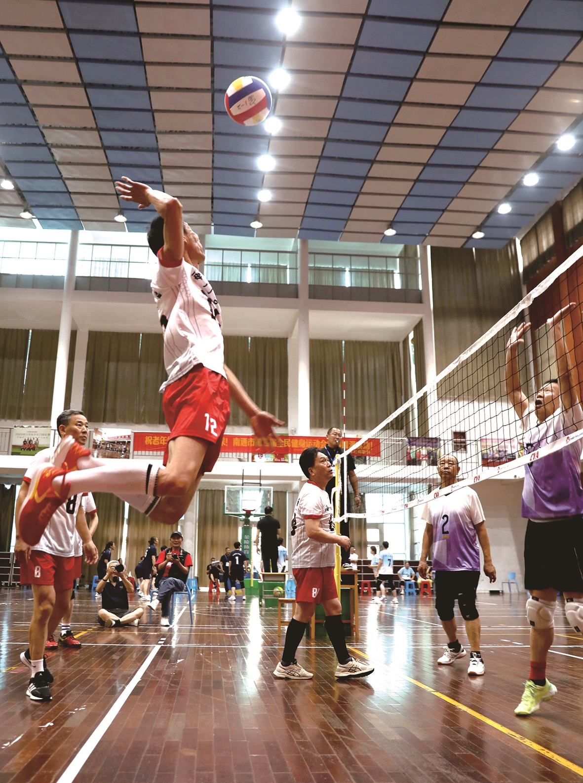 7月15日,南通市第十三届运动会暨第四届全民健身运动会(老年部)“学大杯”气排球比赛在海门区东洲中学体育馆举行。球场上奋力一扣,展现南通银发健儿的矫健身姿,更是“运动不老”的活力画卷。 王亚东
