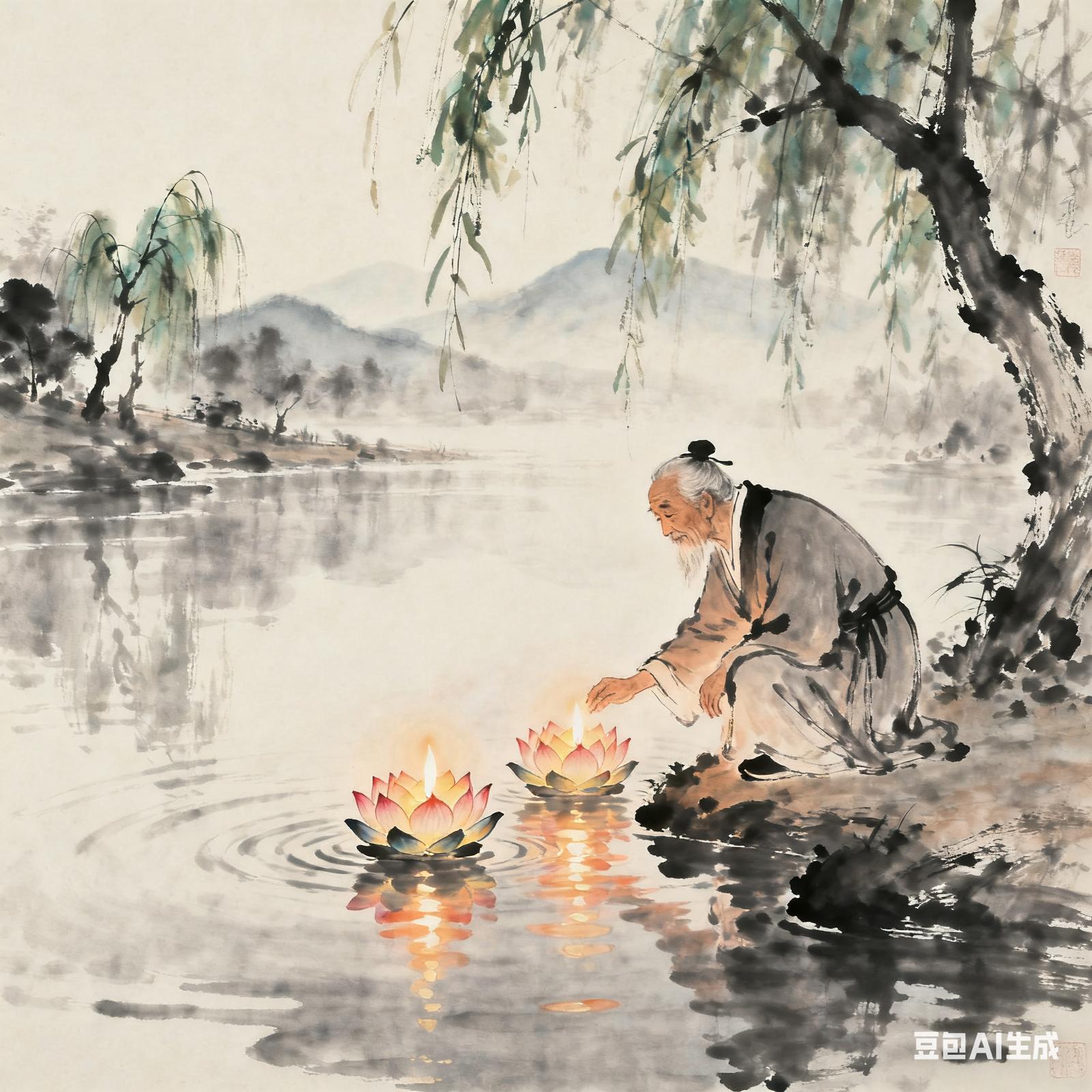 我们小的时候已罕见有人家斋孤,祖父却保持这一传统,七月十五夜里,他都会到家附近的烟墩桥尾去。那年七月半的夜晚有些萧瑟,路上几乎没有行人,祖父在烟墩桥畔燃起一堆斋孤的火焰,火光映在河面上,映红了他饱经沧桑的脸。