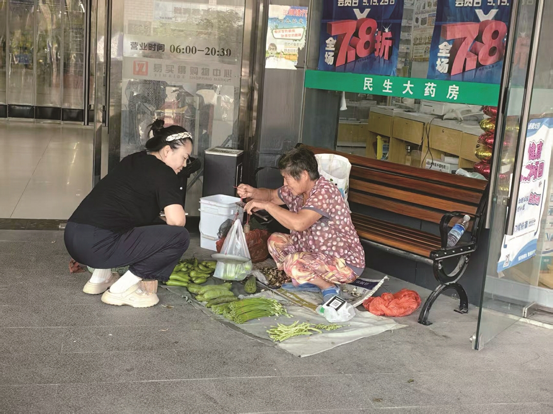 大婶笑着摆摆手:“我在这儿摆了好几个月了,老板从没要过一分钱,你看这门楼能遮风挡雨,还晒不着太阳,超市里的人心肠好着呢!”说话间,几个刚从超市里出来的顾客被地摊上的鲜花生、空心菜吸引。我扫了眼地摊,芋头、丝瓜、茄子、毛豆、韭菜薹、鸡毛菜等全是农家最常见的地皮小菜。
