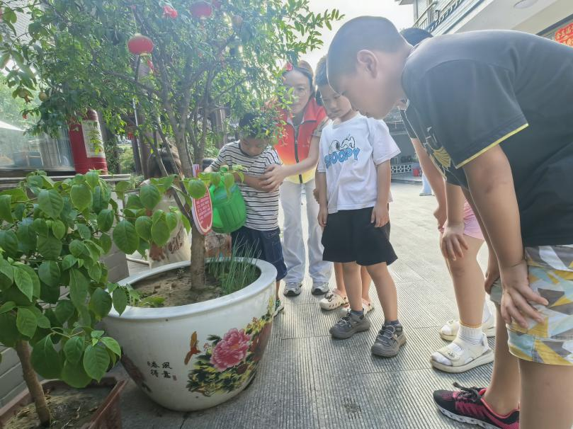为了让青少年更直观地感受花卉生长的美好,志愿者带领孩子们进入最美庭院,一一向孩子们介绍庭院内的各种花卉。在实践环节,志愿者拿起小水壶示范:“浇水不能急,要沿着花盆边缘满满浇,这样才能让根系喝足水,还不会把花芯冲坏。”孩子们迫不及待地接过水壶,按照志愿者教的方法,小心翼翼地为花草浇水,有的孩子还轻轻抚摸叶片,小声地对花儿说:“快喝饱水,长得更漂亮哦!”