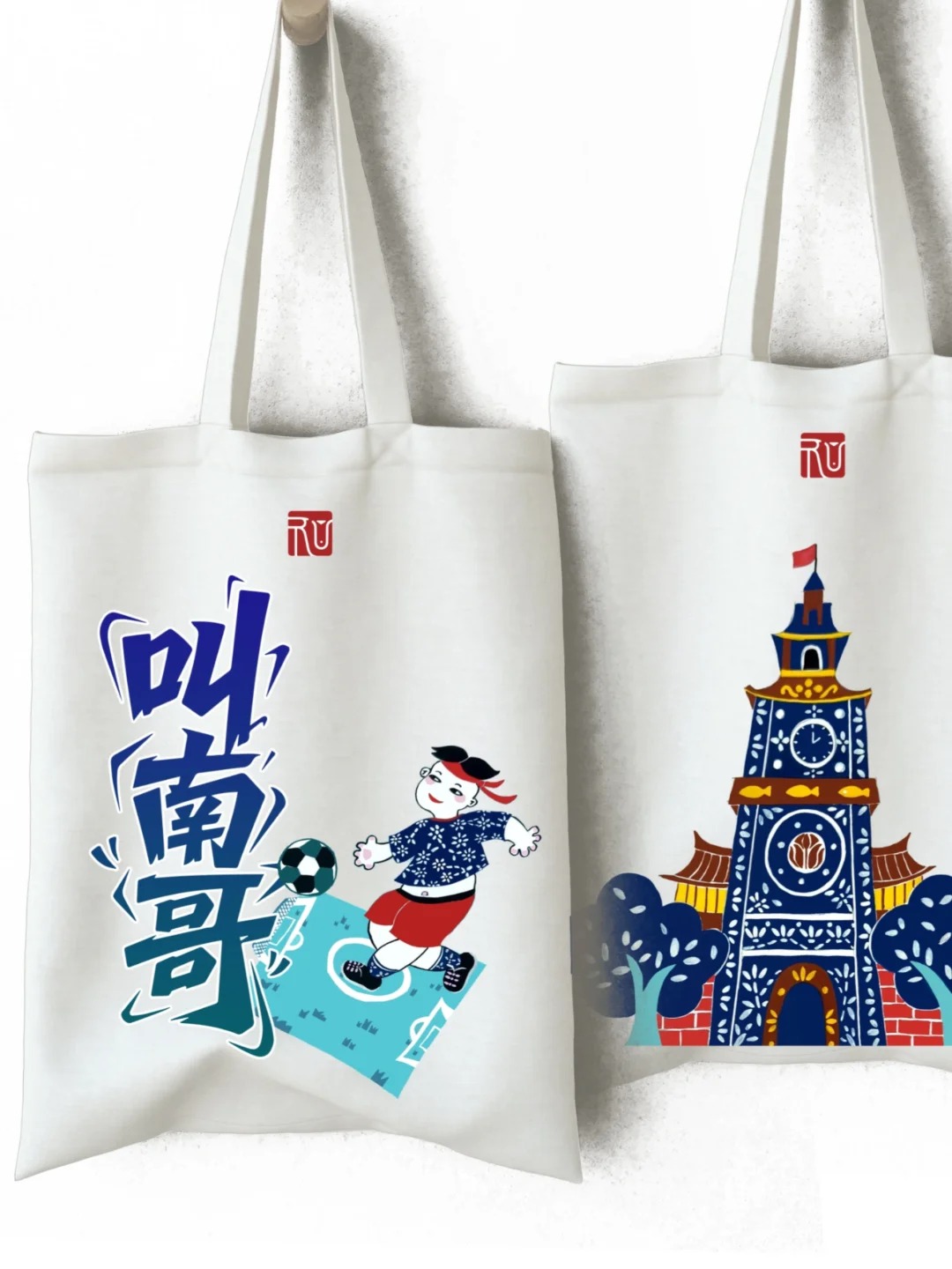 一面是身穿蓝印花布衬衫的少年在绿茵场上尽情奔跑、挥洒汗水,另一面是南通市地标性建筑之一的钟楼,这样两幅纯手绘的农民画作品印刻在帆布包上,既有传统韵味,又不失时尚风采。这便是冒孪国结合顶流“苏超”赛事,精心创作的农民画文创产品。