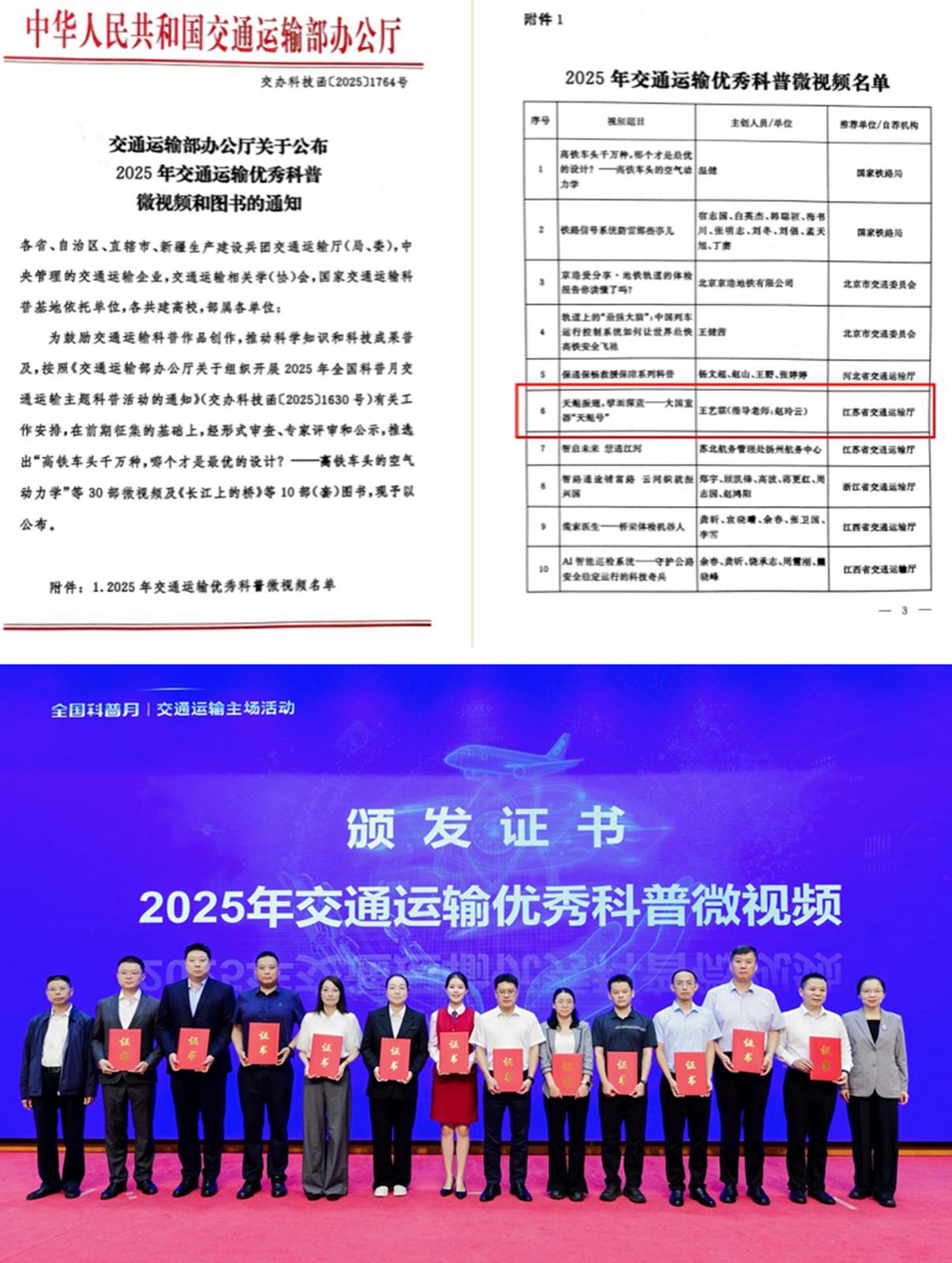 近日,2025年全国科普月交通运输主场活动在北京交通大学举行。活动现场发布了2025年交通运输优秀科普图书及微视频名单,其中,由江苏省交通运输厅推荐、江苏航运职业技术学院报送的《天鲲振翅,擘画深蓝——大国重器“天鲲号”》成功入选,跻身30部交通运输优秀科普微视频榜单。
