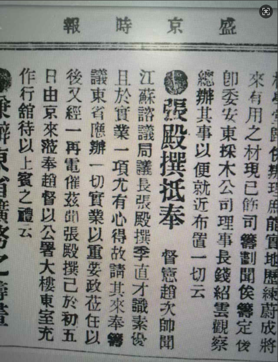 张謇抵达沈阳当天,赵尔巽“待之以上宾之礼”。第二天,赵尔巽安排专人陪同参观沈阳故宫。第三天,两人全天“集议东事”。赵尔巽详细介绍东北三省信息,张謇则提出中美合作开发建议,特别提醒开发“收效极缓,且办理甚难,非贯注全副精神,不克始终其事”。第四天上午,张謇应邀参加了韩国钧主持的旅奉江苏同乡欢迎会,并发表演讲。下午,张謇前往参观留美学生陈铎时创办的农事试验场,认真考察用“大农法”经营的农业新气象。