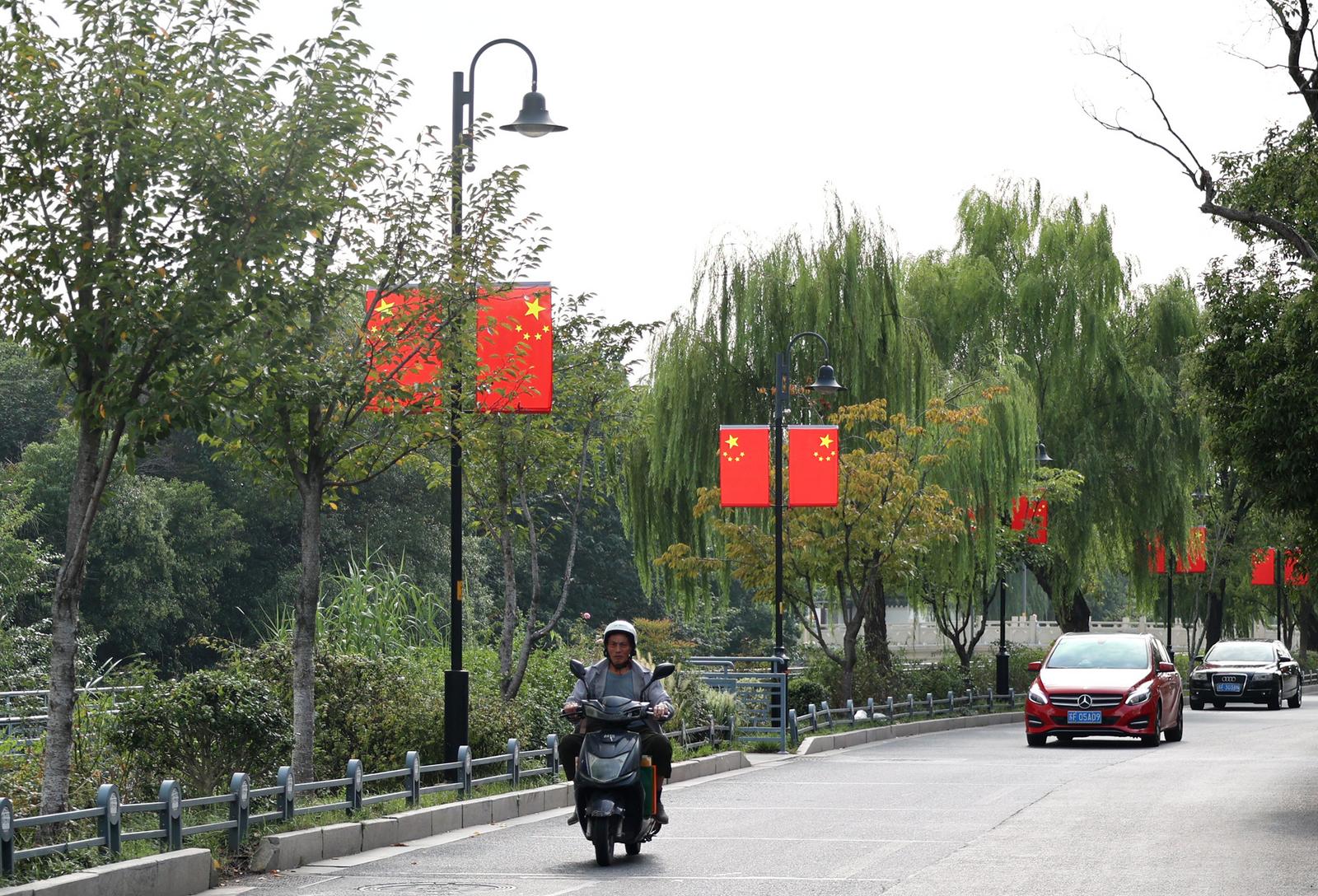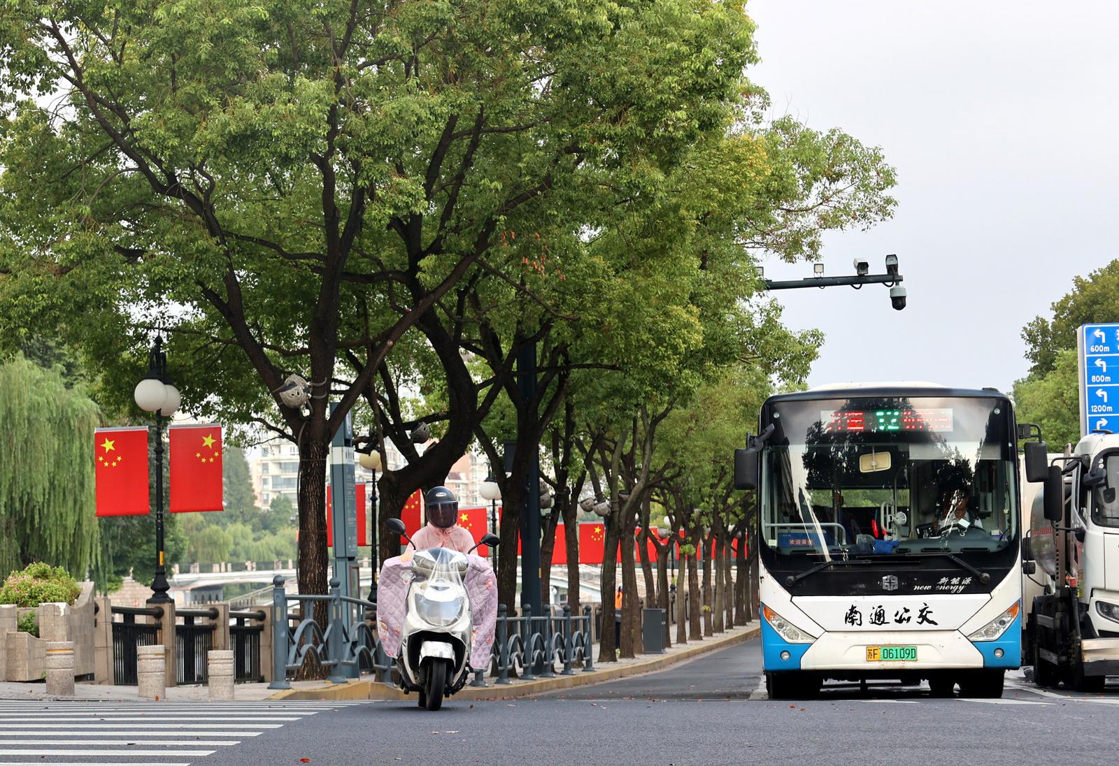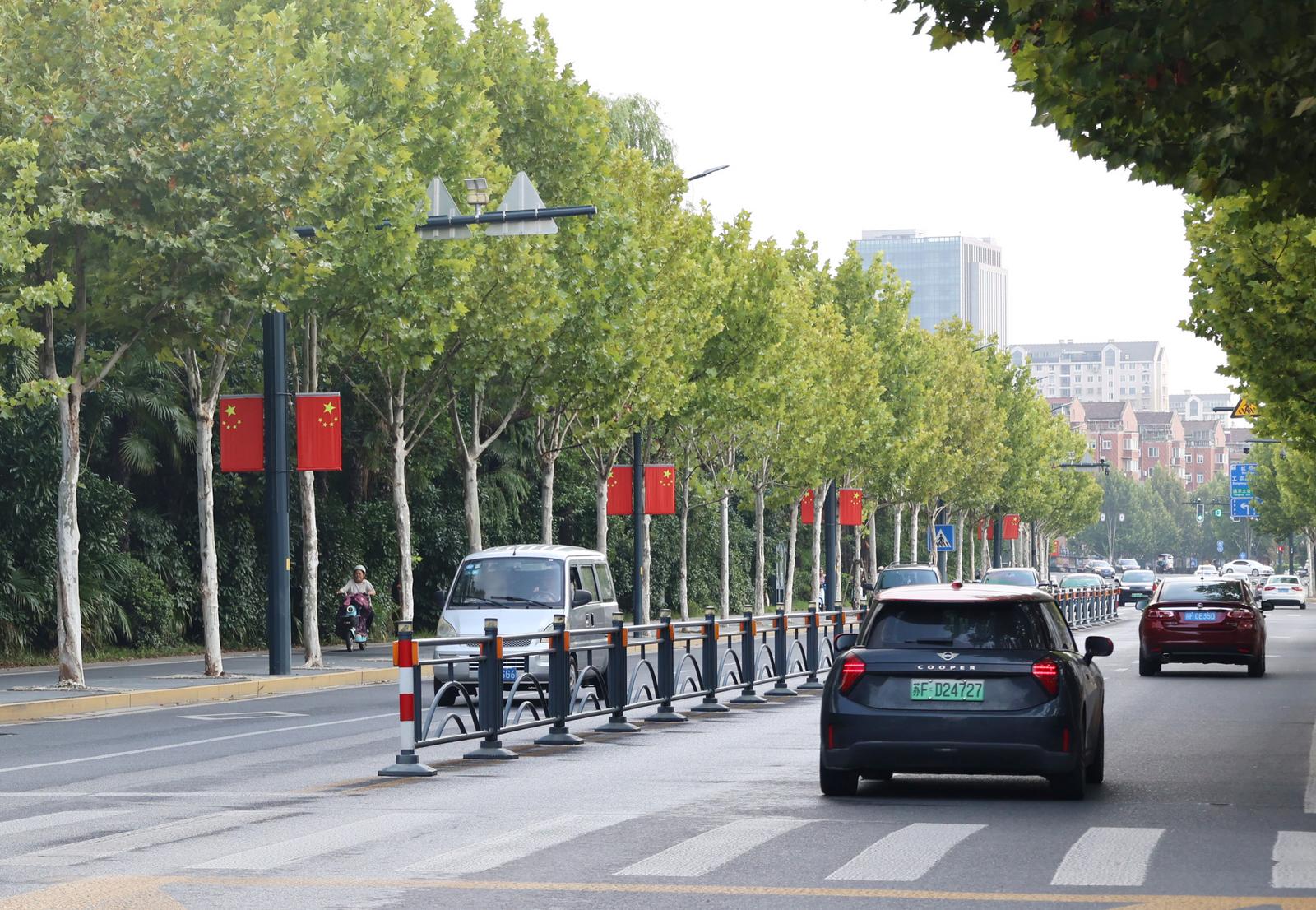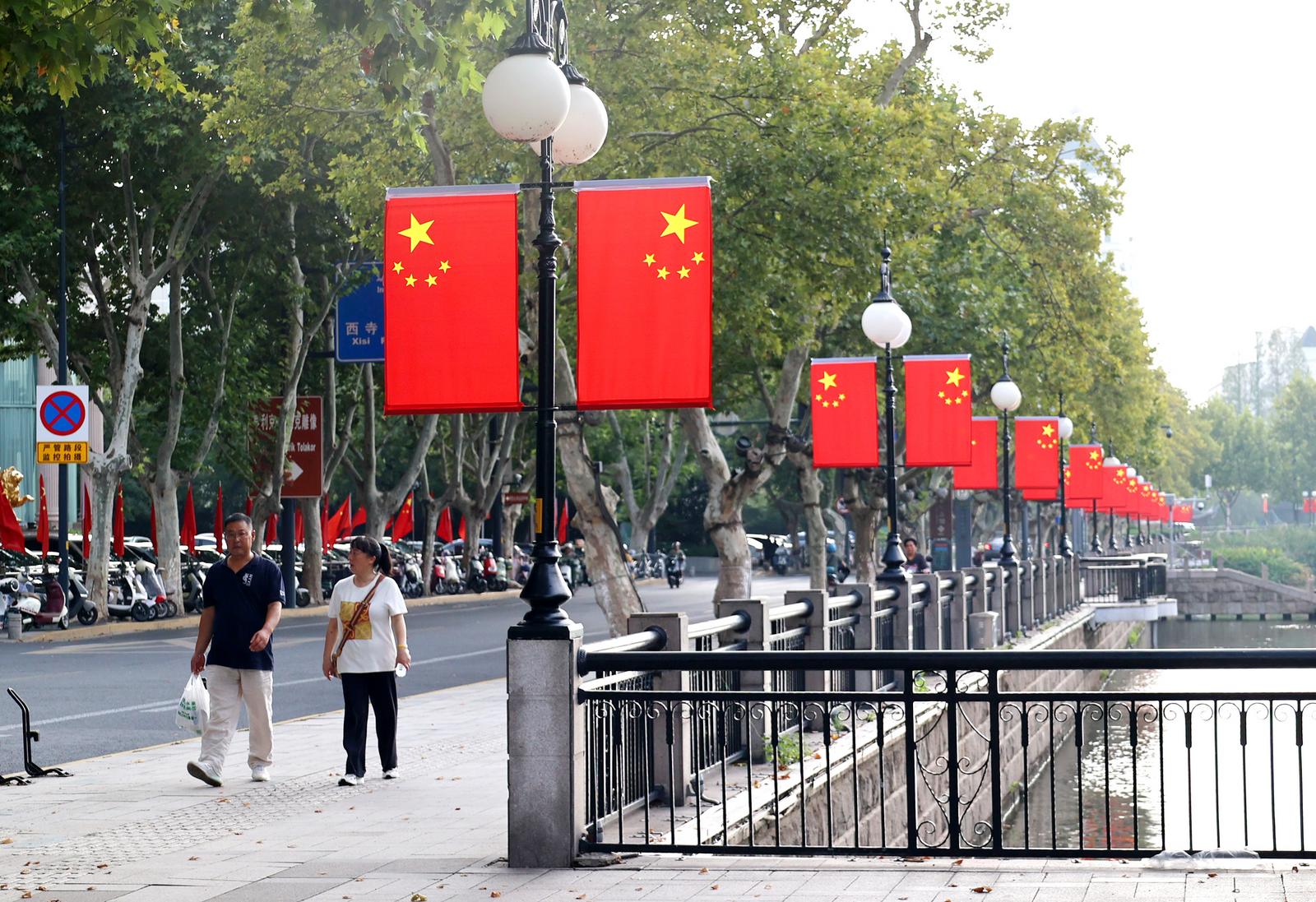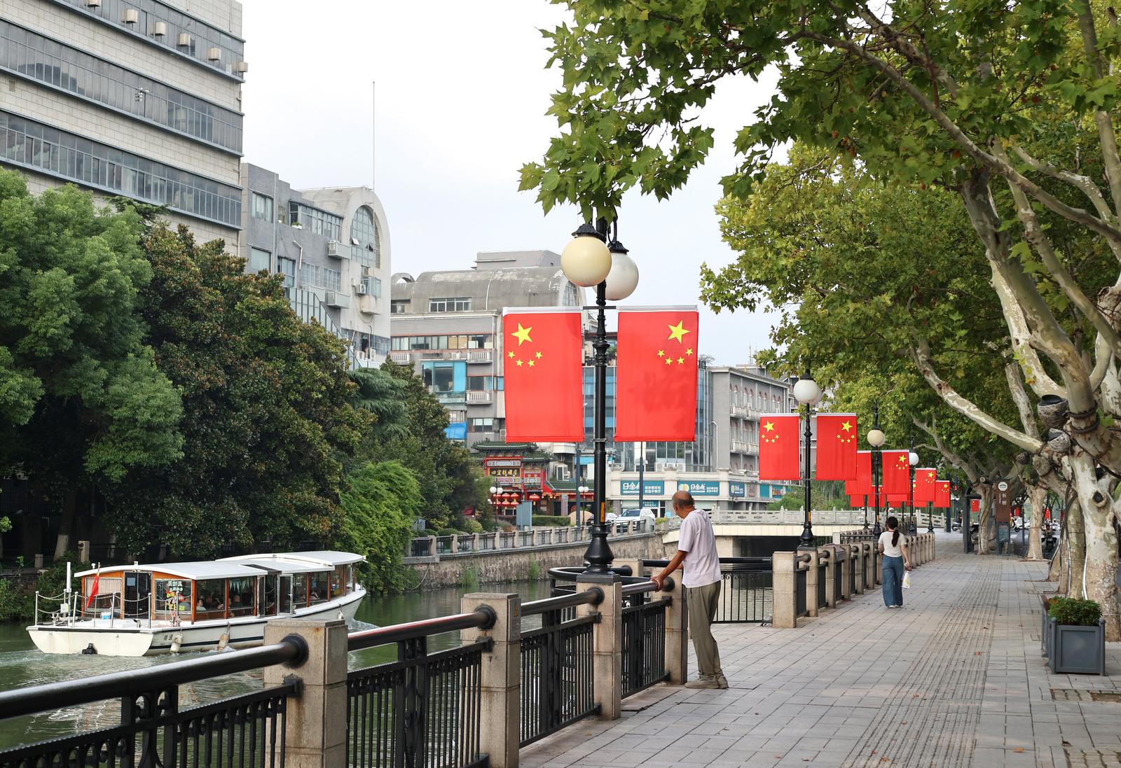 国庆佳节将至,濠河景区内城山路、濠南路等多条主次干道悬挂500余面国旗,鲜艳的五星红旗飘扬,洋溢着喜庆祥和的节日气氛。