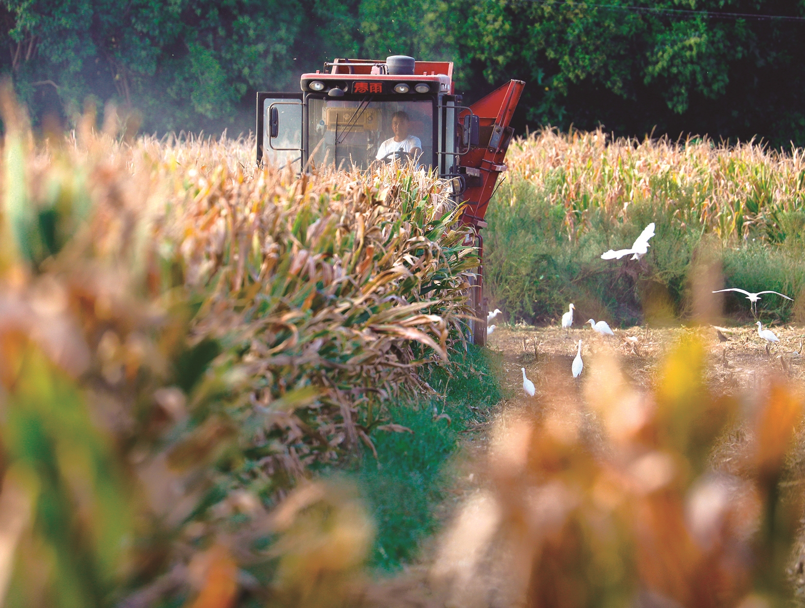 22日,海安经济技术开发区洋蛮河办事处农林村,海安兴林家庭农场玉米地里大型收割机轰鸣穿梭,白鹭翩翩觅食,一派丰收景象。 顾彬斌