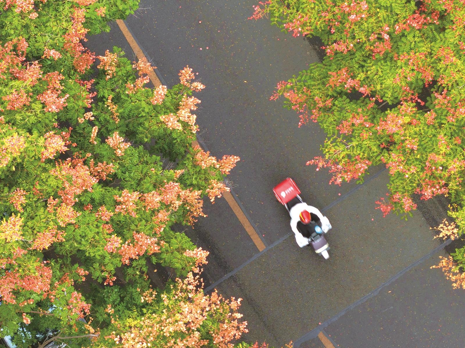 25日,市图书馆北侧江宁路,道路两旁的栾树枝头簇拥着橙红黄色的花和果,一名外卖小哥骑着电动车匆匆而过。 曹纪红