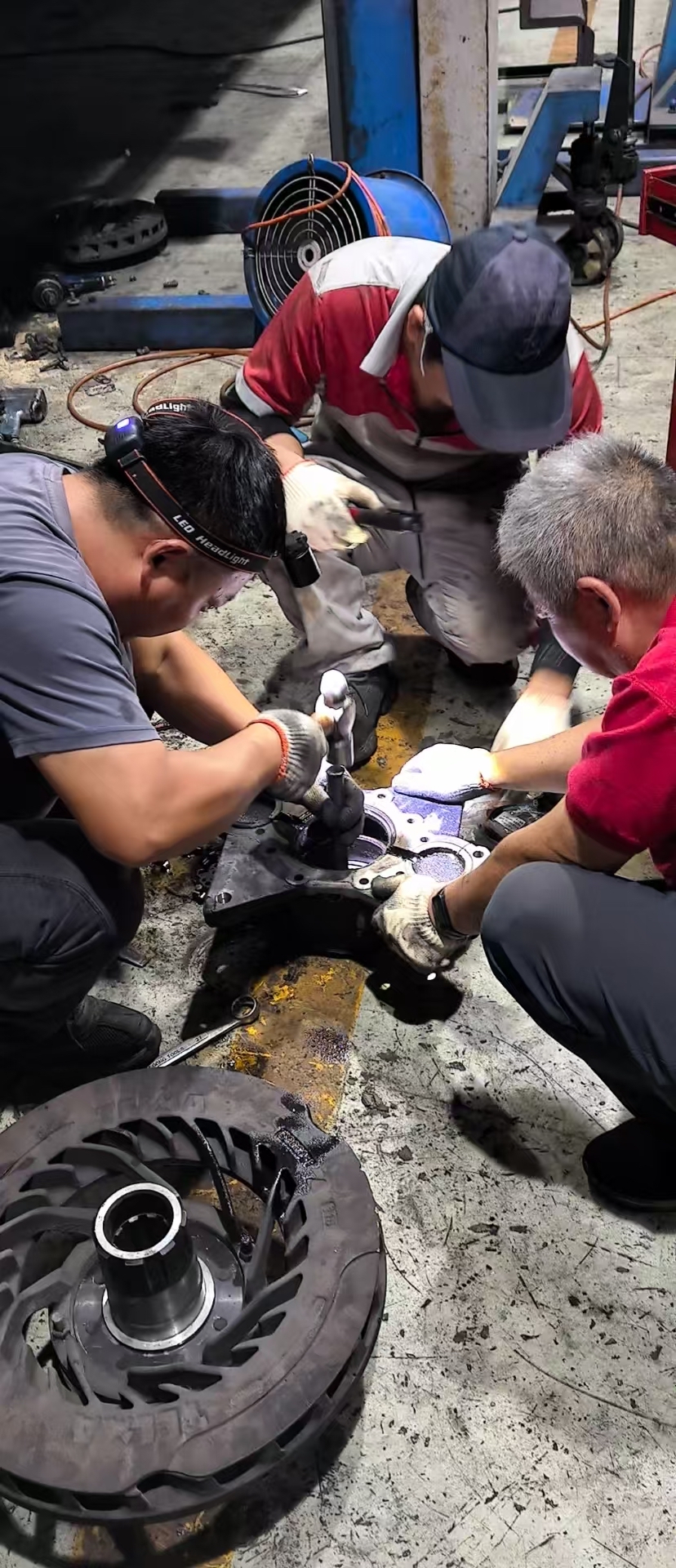 飞鹤修理厂二分厂在接到求助后,没有丝毫迟疑,立即启动应急预案,组织精干抢修力量,携带专业工具和配件,火速奔赴现场。抵达苏通大桥南收费站后,抢修人员迅速对故障车辆进行诊断,确定问题源于离合器系统,必须立即更换离合器压板和离合器片。这是一个位于车辆底部的核心部件,维修工艺复杂,耗时耗力。然而,面对挑战,抢修团队沉着冷静,在应急灯光照射下,他们果断采用“抬变速箱”方案进行作业。