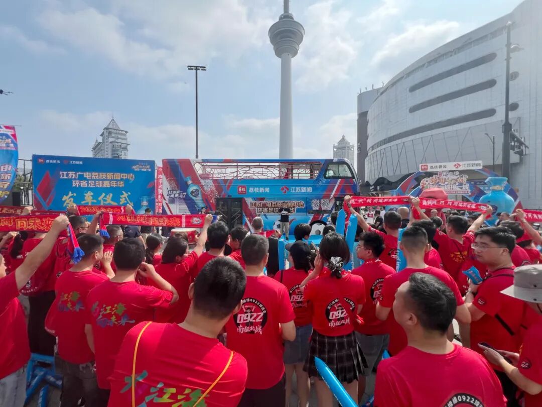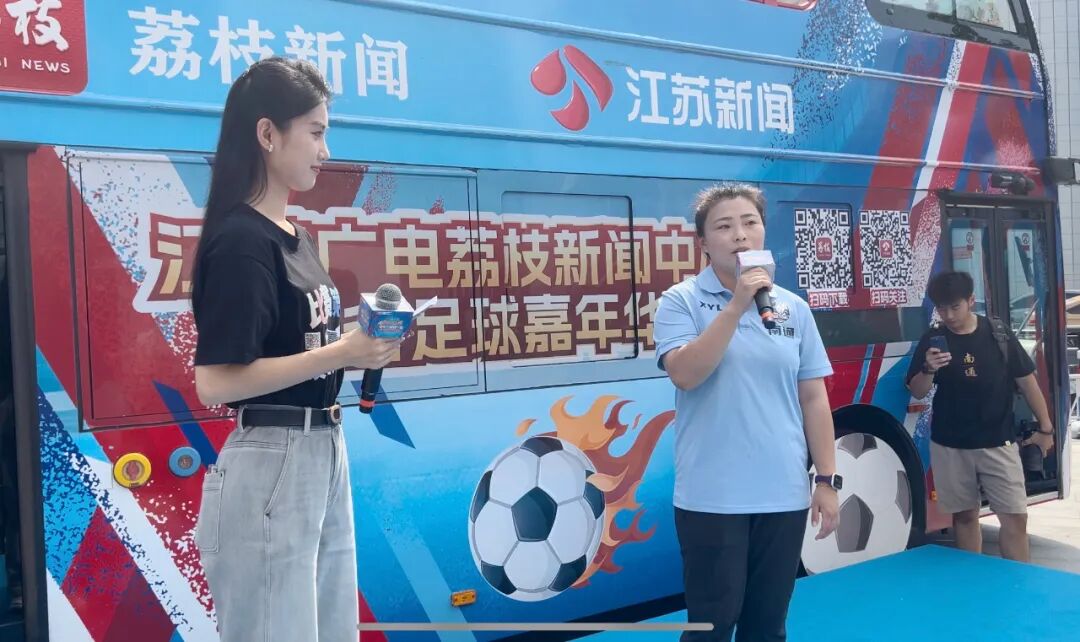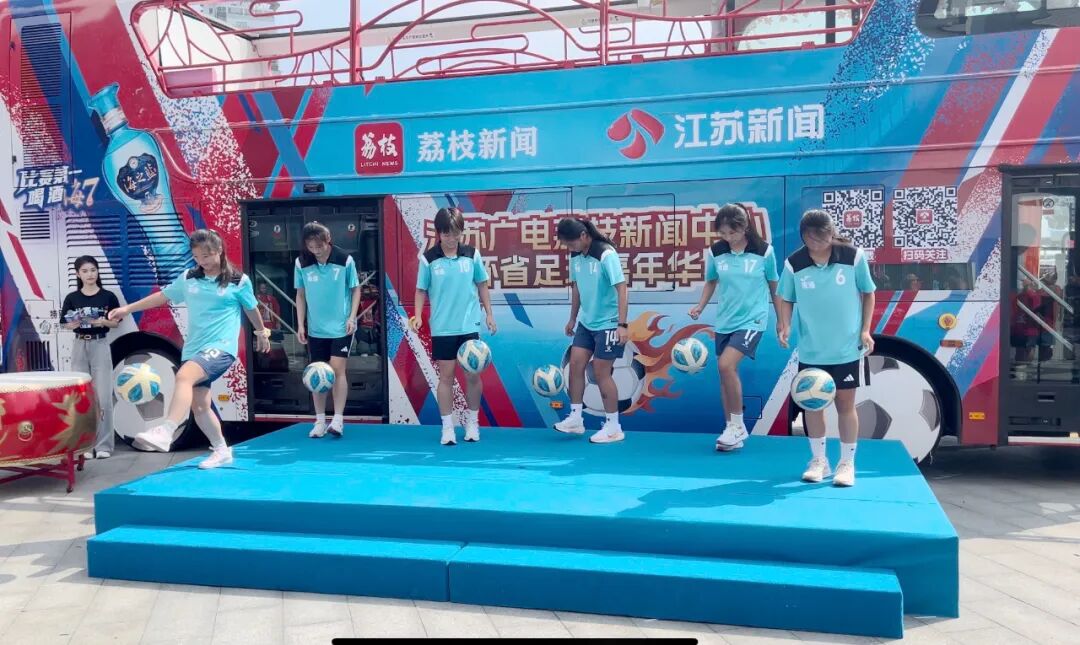 在发车仪式上,蓝红撞色的双层助威大巴格外引人注目。车身不仅印有“澎湃十三城 快乐一城接一城”的活动标语,还巧妙地融入了充满动感的足球元素图案,充分展现了“苏超”赛事的激情与活力。“我们万众一心,go go go……”足球啦啦队的成员们身着鲜艳服装,伴随着《万众一心》的动感旋律,跳起了充满活力的舞蹈,瞬间点燃了现场气氛。来自南通二中女子足球队的队员们进行了精彩的足球技巧表演,赢得观众阵阵喝彩,尽显“省长杯”夺冠队伍的风采。帮助校队夺冠的二中女足队员陆罗兰表示:“南通队在‘苏超’一直表现优异,我很受鼓舞。我会继续踢球,像他们一样为家乡争光!”“南通必胜”“南通加油”“光荣属于南通……”来自东洲、海门珂缔缘0922、杏林联等球迷会的球迷们纷纷赶到活动现场,身着红色助威服,挥舞旗帜,高喊助威口号,为南通队加油鼓劲。东方中学的足球班老师季鑫琳,同时也是一位资深球迷,她激动地表示:“这样的活动非常好,能够将球迷们紧密团结在一起。希望足球文化能够生生不息地传承下去,激励更多的人为城市而战、贡献力量。”当天,中国女子足球队的前国脚、被誉为“小梅西”的南通籍名将许燕露一登场,便赢得全场热烈的欢呼。退役后,许燕露回到家乡,目前在市体育运动学校担任足球教练,致力于培养新一代足球人才。她笑容满面地说:“看到‘苏超’如此火爆,这表明越来越多的人热爱足球,我感到无比欣慰。足球的成功离不开团队的凝聚力、拼搏精神、场上的绝对信任、无私的配合以及坚韧不拔的意志,还有那种不到最后一秒决不放弃的坚定信念。祝愿南通队再创辉煌,加油!”随着嘉宾们共同敲响鼓槌,助威巴士启程发车。它途经狼山、南通长江体育公园等多个南通文化旅游地标,将于傍晚抵达南通体育会展中心,与广大球迷互动并共同见证“苏超”淘汰赛南通队主场对阵淮安队的焦点之战。据了解,“澎湃十三城 快乐一城接一城”环省足球嘉年华活动由江苏广电总台新闻频道发起,采用双层巴士助威巡游的形式,在十三个地级市依次展开,将苏超联赛的热烈氛围传播至全省各地,让“苏超”的精神与活力深入全省。