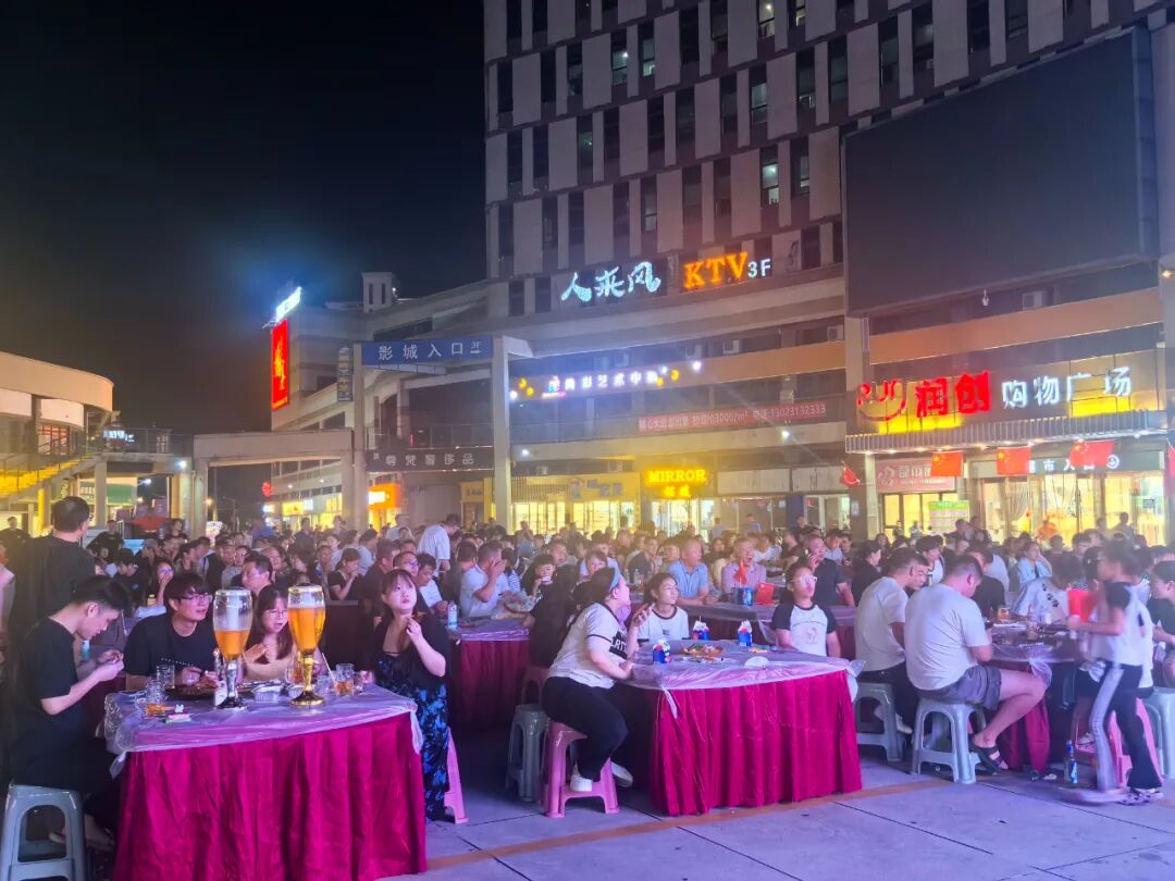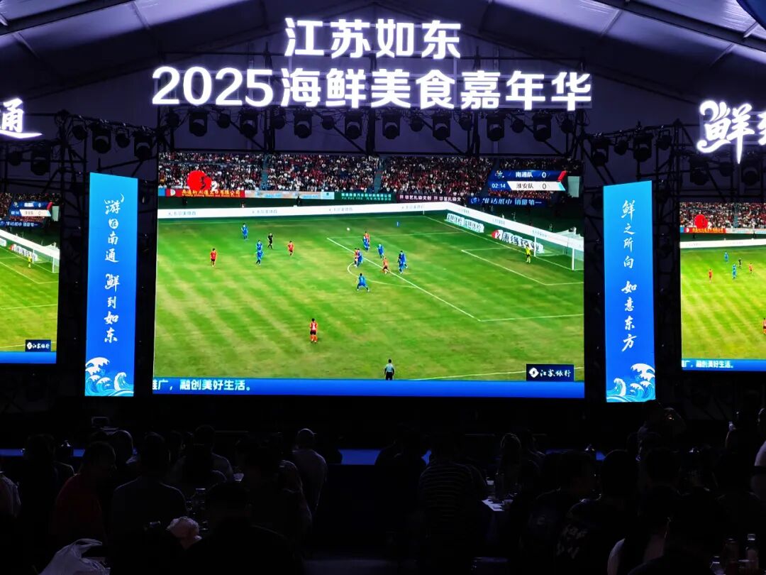 喜润城的超清巨幕下,氛围同样热烈。球迷们或站或坐,将巨幕围得水泄不通。随着直播信号切入,现场瞬间安静下来,当镜头扫过主场球员热身画面时,观众席率先响起阵阵掌声,不少人自发举起“南通加油”的手牌,开启助威模式。观赛间隙,球迷们还能去品尝各种美味,啤酒、烤串、小吃…… 美食与足球的碰撞,让幸福感直线飙升。