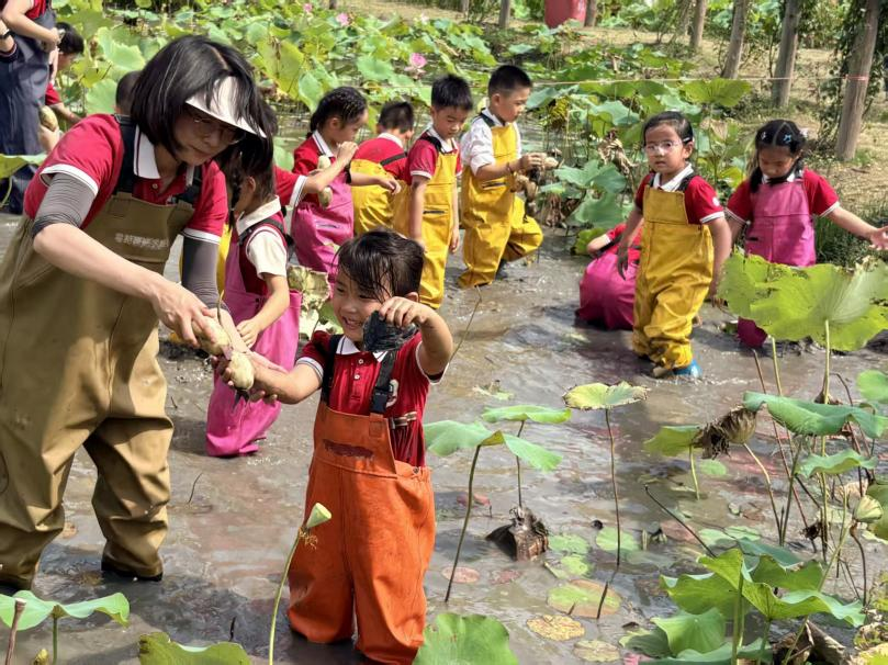 活动的最后,孩子们来到了平园池,开启了有趣的摘莲藕体验。通过亲手摘莲藕,孩子们不仅认识了莲藕的生长环境,还在劳动中体会到了收获的快乐,进一步激发了对大自然的热爱之情。