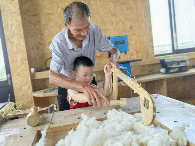 蓉塘社区联合爱蒙幼儿园开展活动。志愿者首先向孩子们介绍了棉花的用途,以及弹棉花这一传统手工技艺的历史,随后便邀请非遗传承人现场演示了简单的弹棉花过程。孩子们小心翼翼地弹棉花,在动手实践中感受传统手工的独特魅力。