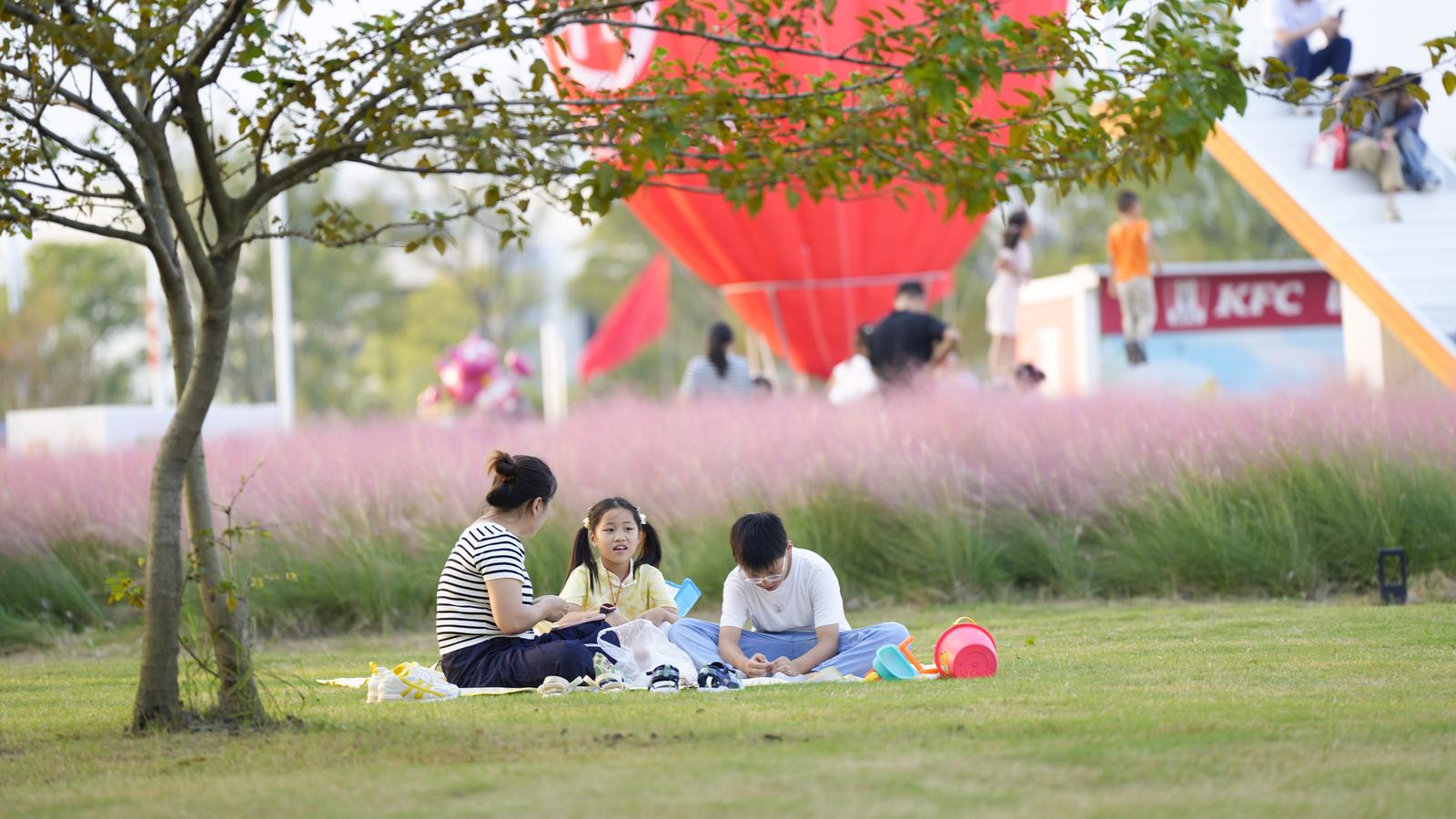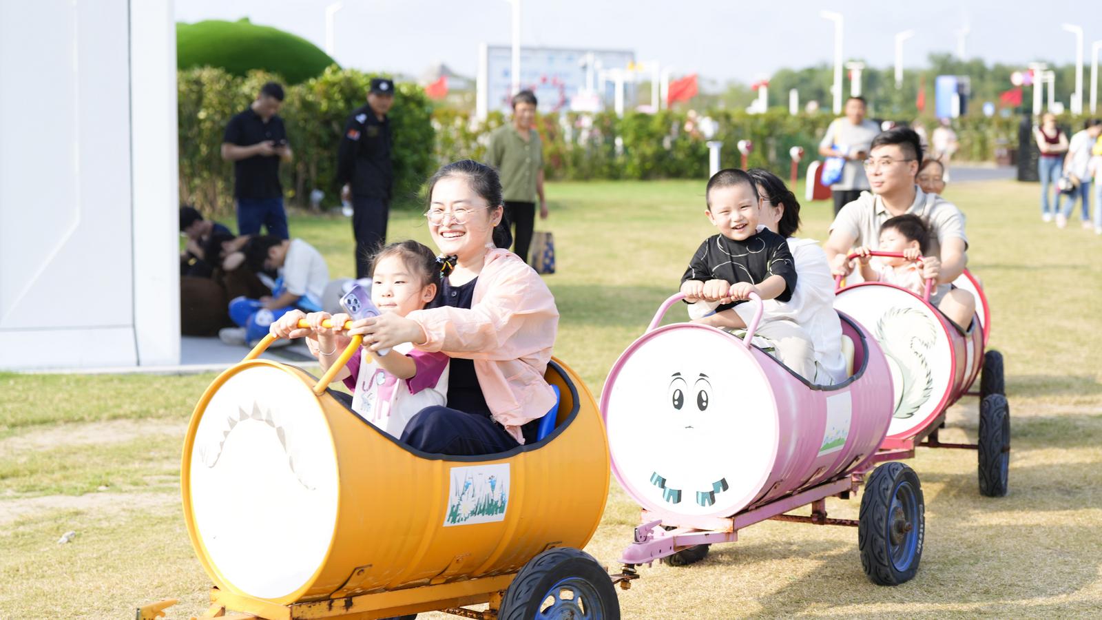 在不远处的桃花岛上,蹦蹦床、彩虹滑道、旋转木马、沙滩坦克车……一些以往仅在游乐场能体验的项目被搬到营地里,在家长陪同下,孩子们正乐此不疲地排队游玩。一旁的露营区里,不少家庭还支起了帐篷,大家或坐或躺,分享着美食,欣赏着美景,感受着这份放松与温馨。“难得的‘遛娃’宝地,我们抢到了晚上的海底捞包仓,等着看烟花秀和打铁花!”市民曹霞感慨:“孩子骑了马、坐了小火车,玩得特别开心,我们大人也轻松。”