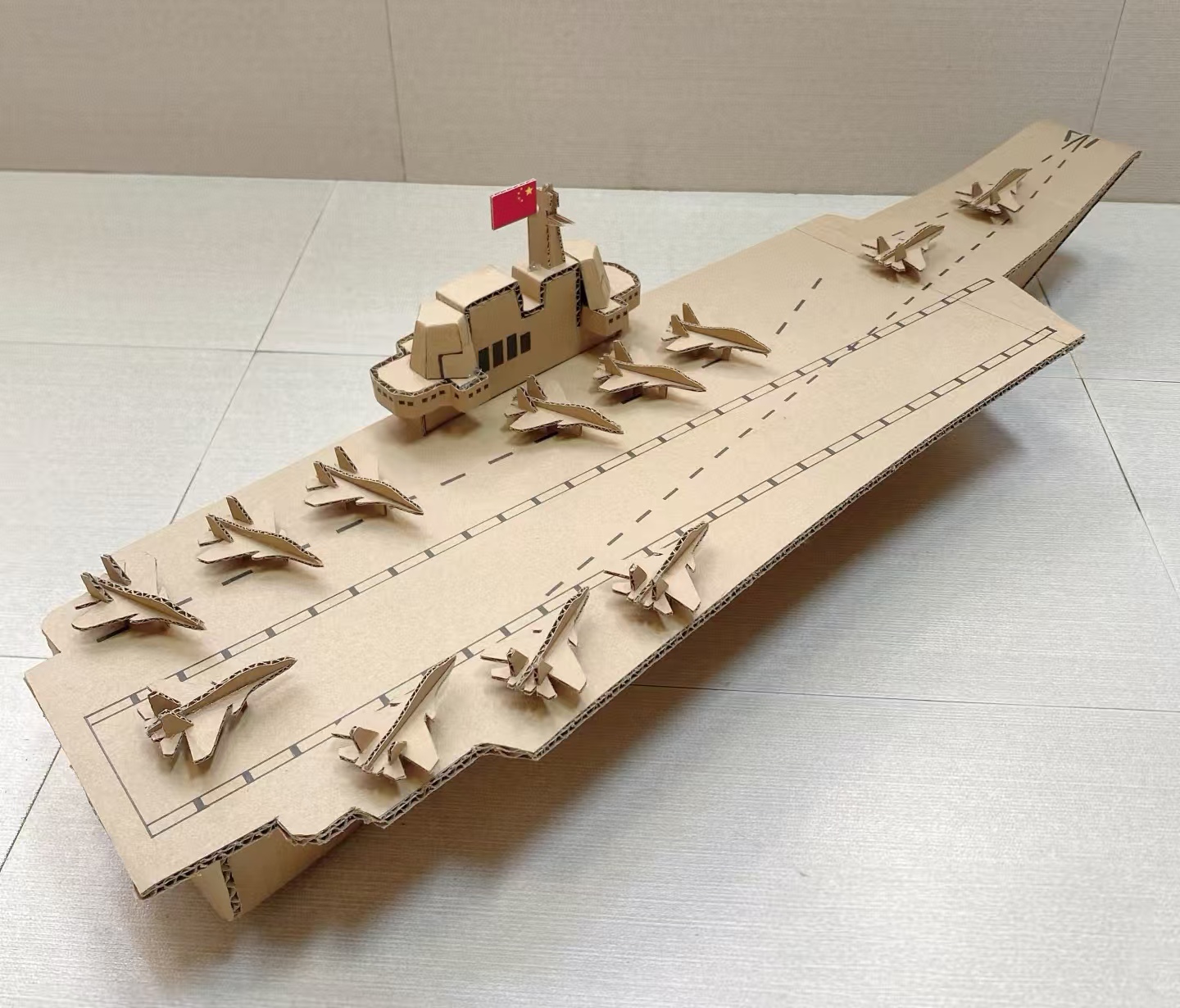 高年级学生用创意演绎传承之美。他们收集塑料瓶、纸板等废品,打造歼-20战斗机、山东舰等模型,附上百字说明讲述强国梦想,让环保理念与国防教育同频共振。更令人惊艳的是“时空对话”环节:亲子合作创编剧本,借助AI换脸技术穿越抗战年代,与先烈共话中秋。“前辈您看,如今我们的航母能在海上赏月,这盛世如您所愿!”
